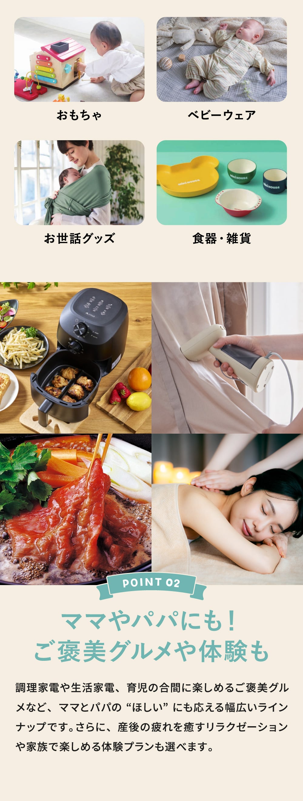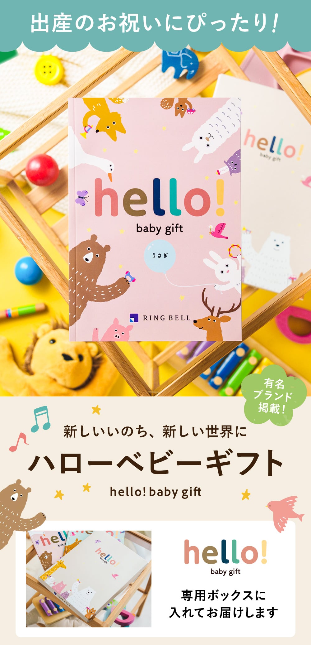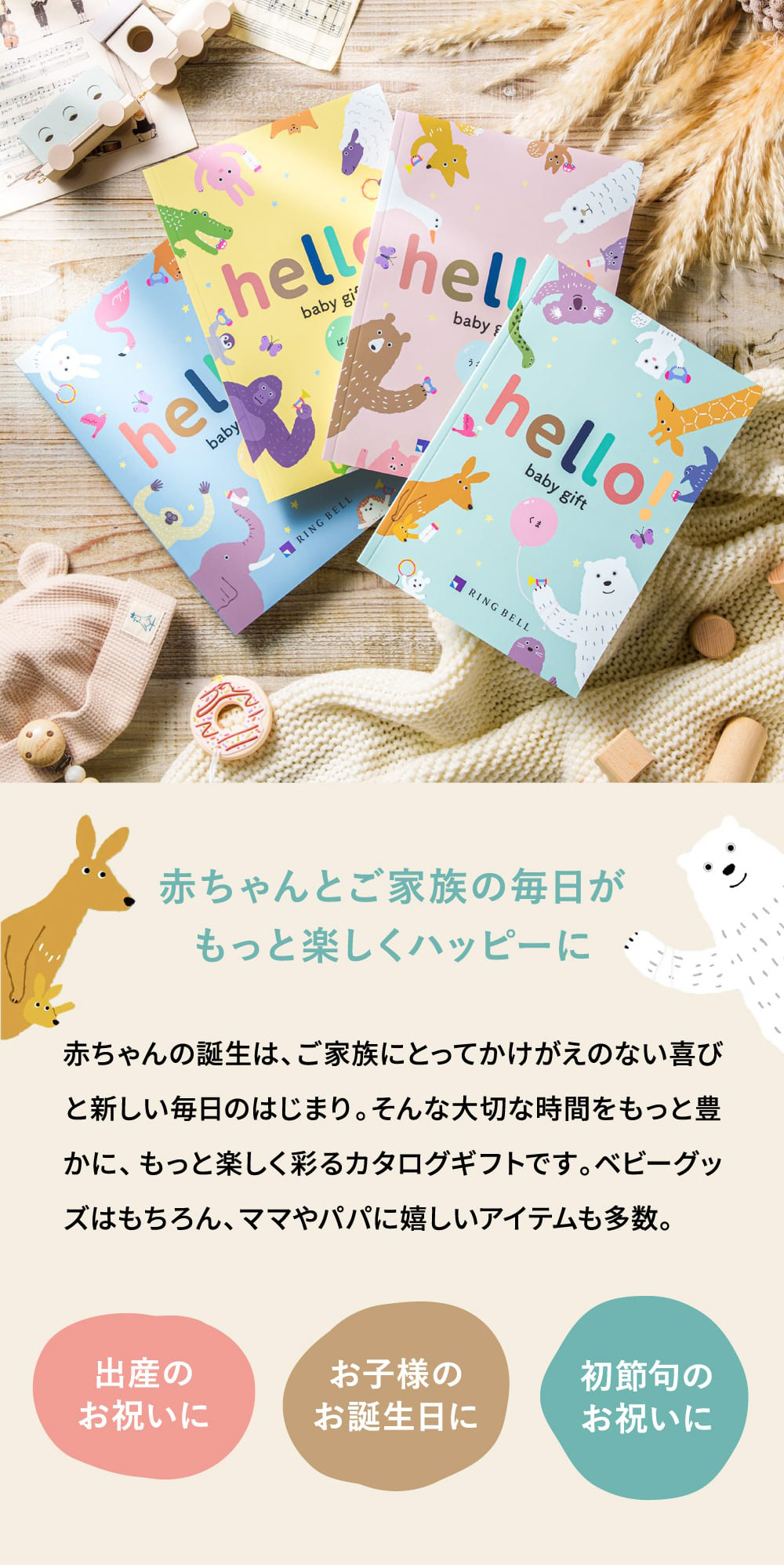 出産祝いに人気のカタログギフト「ハローベビーギフト」は、ベビーの誕生をお祝いするのにぴったりなギフトです。おしゃれで実用的なベビーグッズや、お子さまの成長に合わせて長く使えるアイテムも豊富に掲載。出産祝いをはじめ、1歳の誕生日プレゼントや初節句など、さまざまなお祝いシーンにもおすすめです。 |