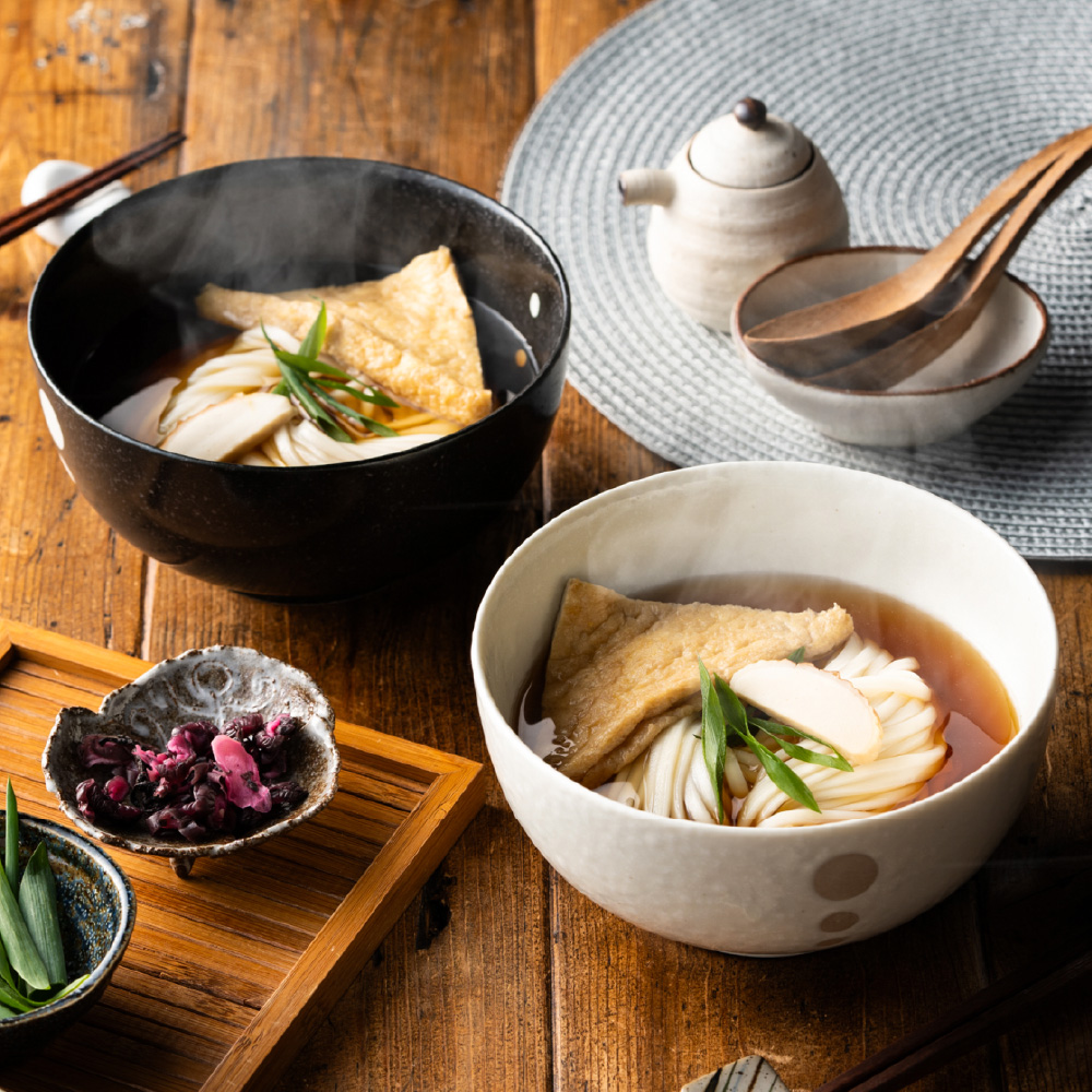ゆで時間8分で麺にこだわりの食感を実現。お出汁は国産の鰹節と昆布を使用。もっちり食感が生まれ、茹でた際に表面がキュッとしまり、のど越しがより一層味わえます。