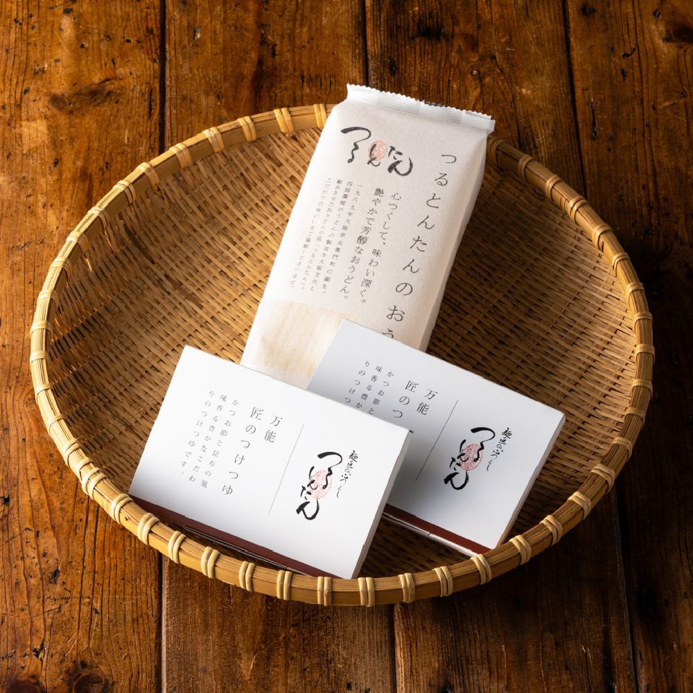 人気のうどん専門店「つるとんたん」の味を、ご家庭でもお楽しみいただける麺とお出汁のセットです。艶やかで芳醇なおうどんと、肉厚の昆布と上質な鰹節から生まれた「万能匠のかけつゆ」をご堪能ください。太く長い人生になるようにと願いが込められた縁起物として、お祝い事などの贈り物にピッタリです。