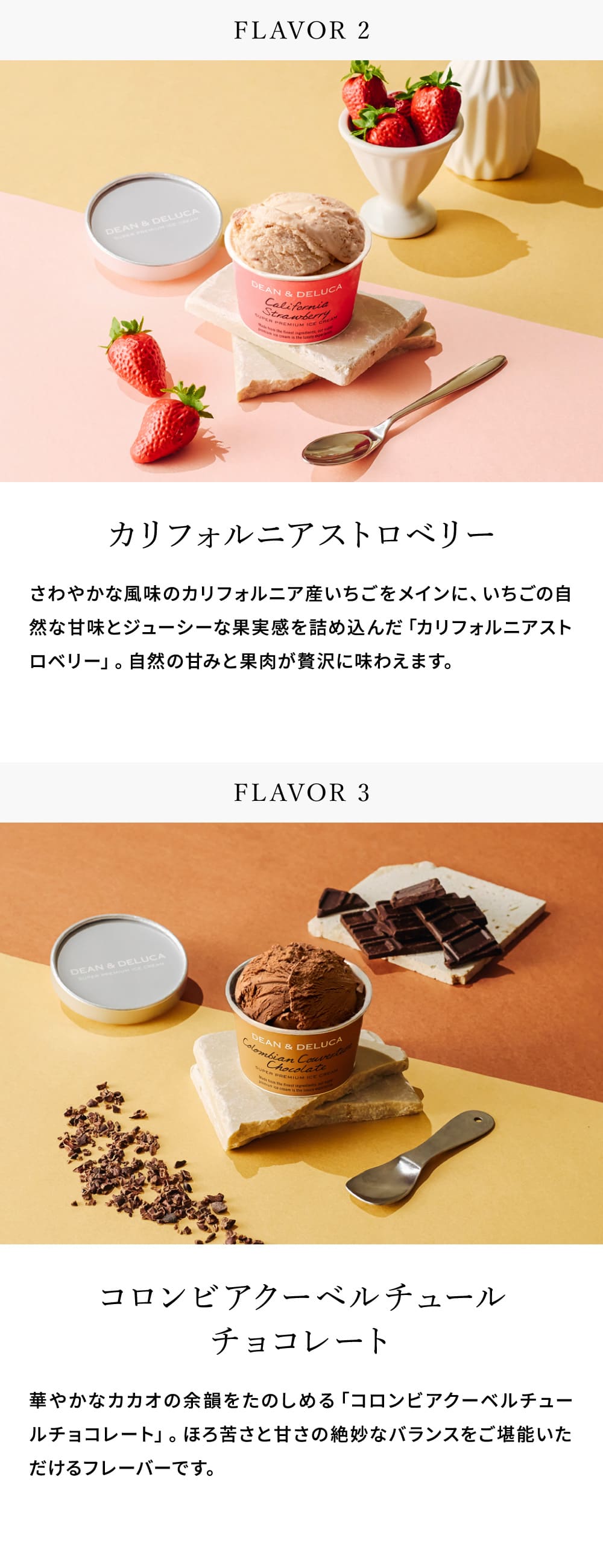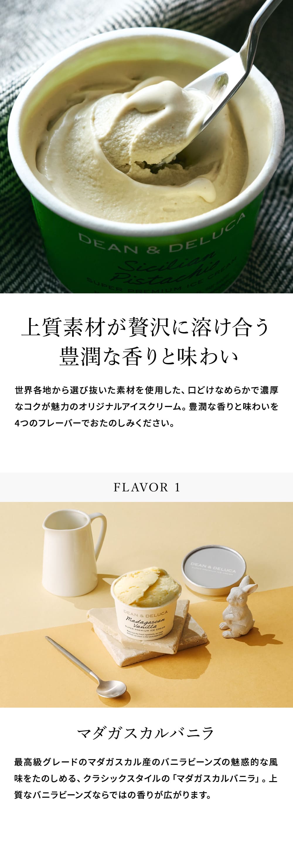 世界有数の産地の上質素材と、乳のコクや甘味を濃縮したミルクでつくった、濃厚な味わいのアイスクリーム。甘酸っぱいいちごの果実感あふれる「カリフォルニアストロベリー」、最高級バニラビーンズの風味が贅沢に広がる「マダガスカルバニラ」、希少なピスタチオの濃厚な風味を堪能できる「シチリアンピスタチオ」、ほろ苦さと甘さのバランスに優れた「コロンビアクーベルチュールチョコレート」。4つのフレーバーでお届けします。