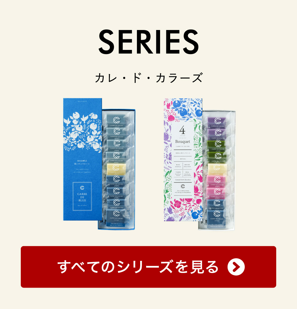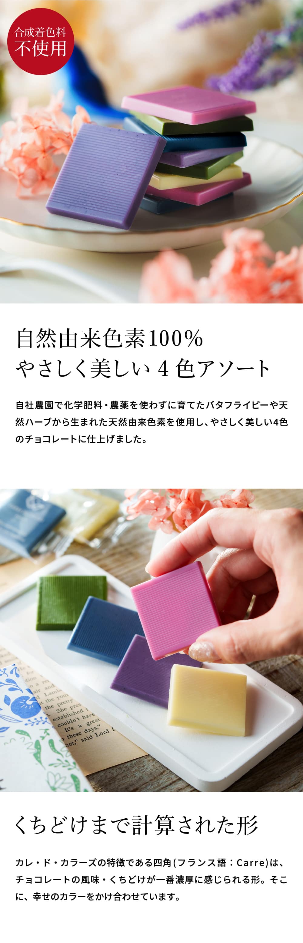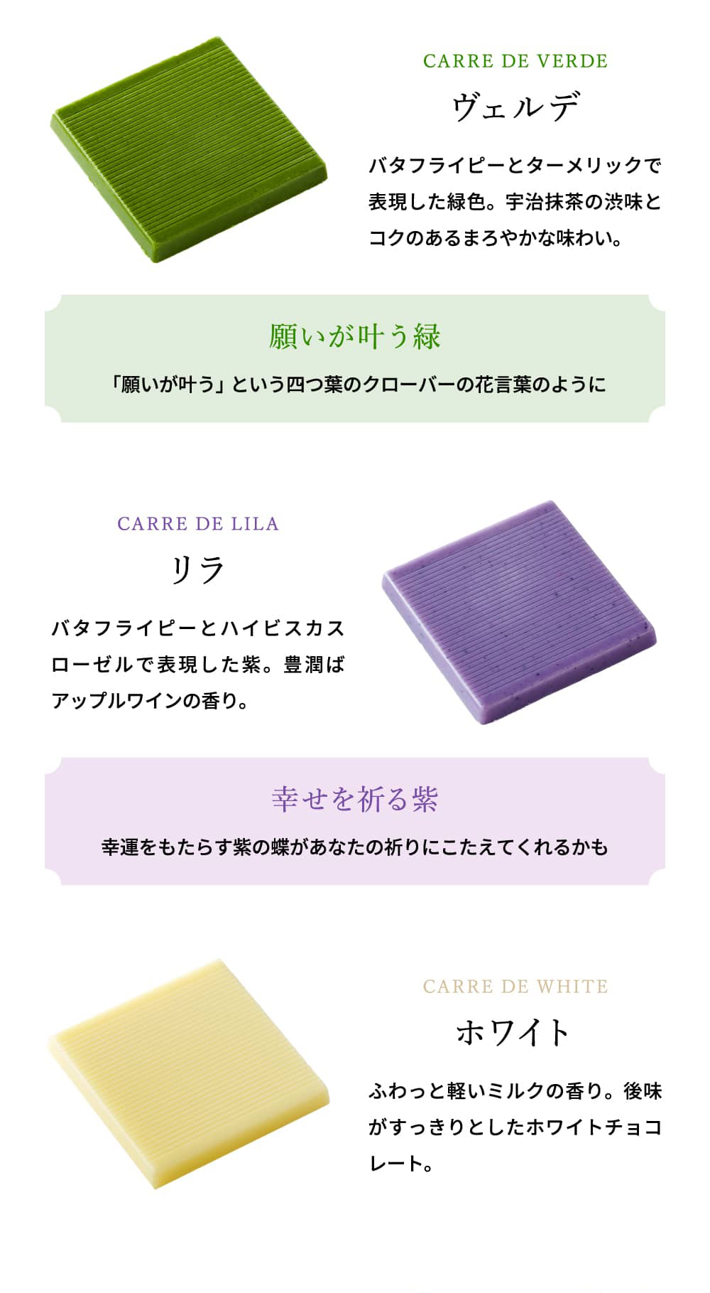 ●原材料:【ブルー】チョコレート(国内製造(砂糖、ココアバター、全粉乳、脱脂粉乳))/着色料(バタフライピーパウダー)、乳化剤、香料、(一部に乳成分・大豆を含む)【ルージュ】チョコレート(国内製造(ココアバター、砂糖、乳糖、バターミルクパウダー))、ハイビスカスパウダー/野菜色素、酸味料、乳化剤、(一部に乳成分・大豆を含む)【ヴェルデ】チョコレート(国内製造(砂糖、ココアバター、全粉乳、脱脂粉乳))、抹茶/着色料(バタフライピーパウダー、ウコンパウダー)、香料、乳化剤、(一部に乳成分・大豆を含む)【リラ】チョコレート(国内製造(ココアバター、砂糖、乳糖、バターミルクパウダー))、ハイビスカスパウダー/野菜色素、着色料(バタフライピーパウダー)、乳化剤、香料、(一部に乳成分・大豆を含む)【ホワイト】チョコレート(国内製造(ココアバター、砂糖、乳糖、バターミルクパウダー))/乳化剤、(一部に乳成分・大豆を含む)