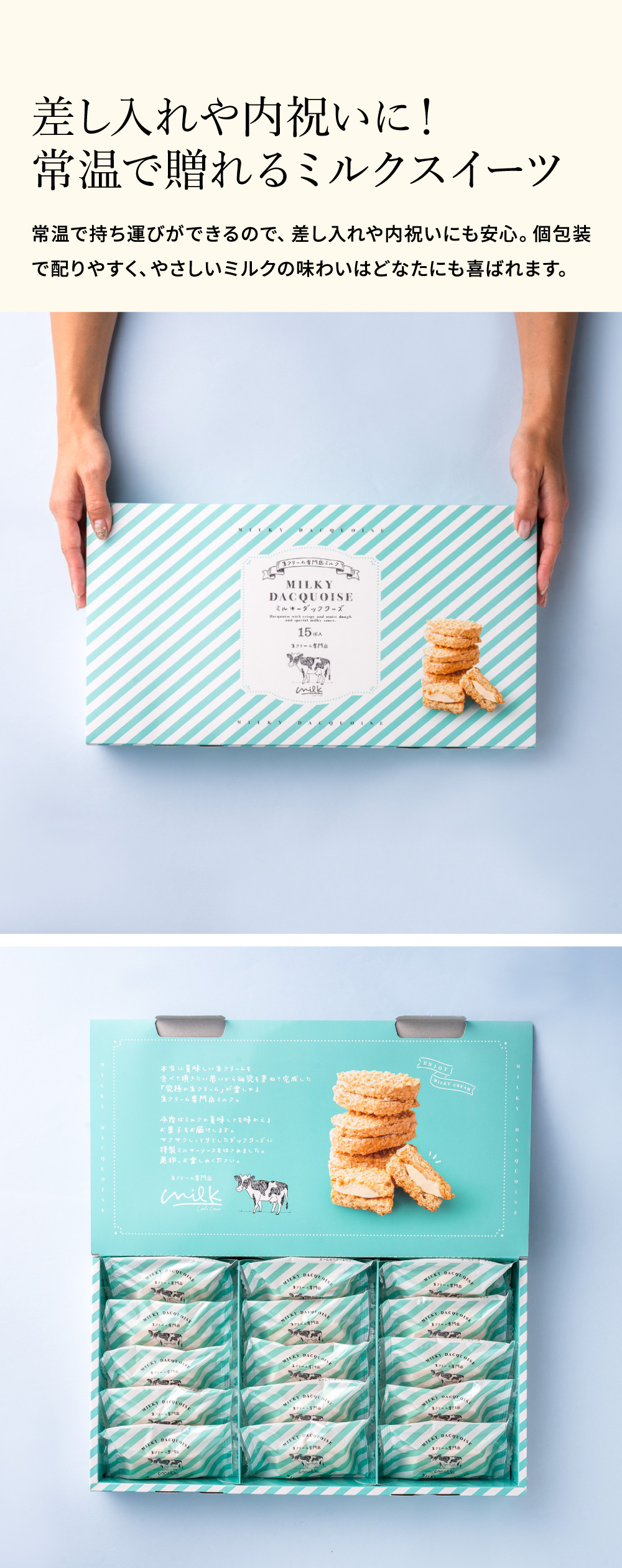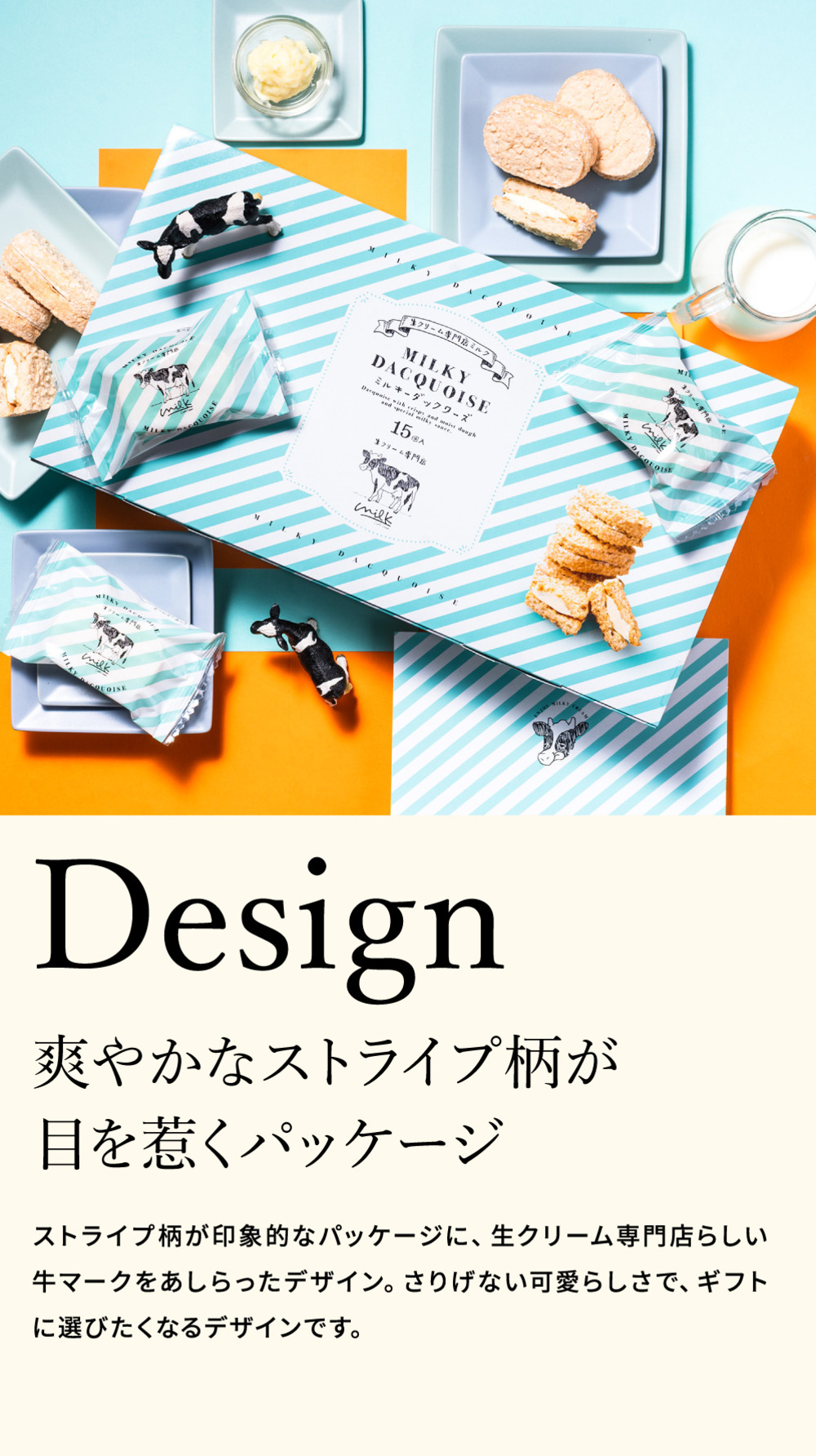 さっくり食感のダックワーズに、滑らかな特製ミルキークリームをはさんだ飽きのこない美味しさをお届けします。