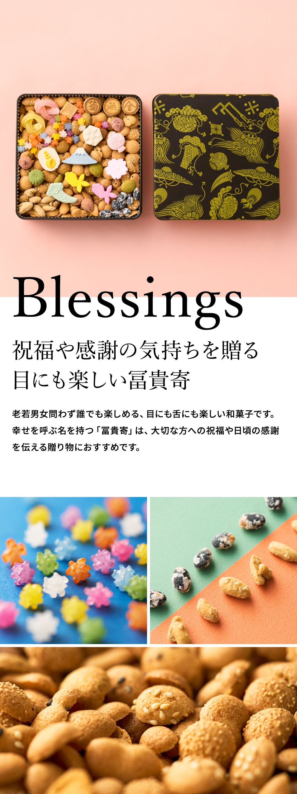 ●原材料:小麦粉(小麦(北海道産))、砂糖、鶏卵、和三盆糖、落花生、大豆、ごま、黒糖、抹茶、しそ粉(しそ、食塩、梅酢)、生姜粉末、ココナッツ、けしの実、ココア、青海苔、豌豆粉、餅米粉、澱粉、水飴、寒天、食用精製加工油脂、食用植物油脂、食塩/着色料(ビートレッド、クチナシ色素、ベニバナ色素、パプリカ色素、カラメル色素、ベニコウジ色素)、香料、酸味料、乳化剤