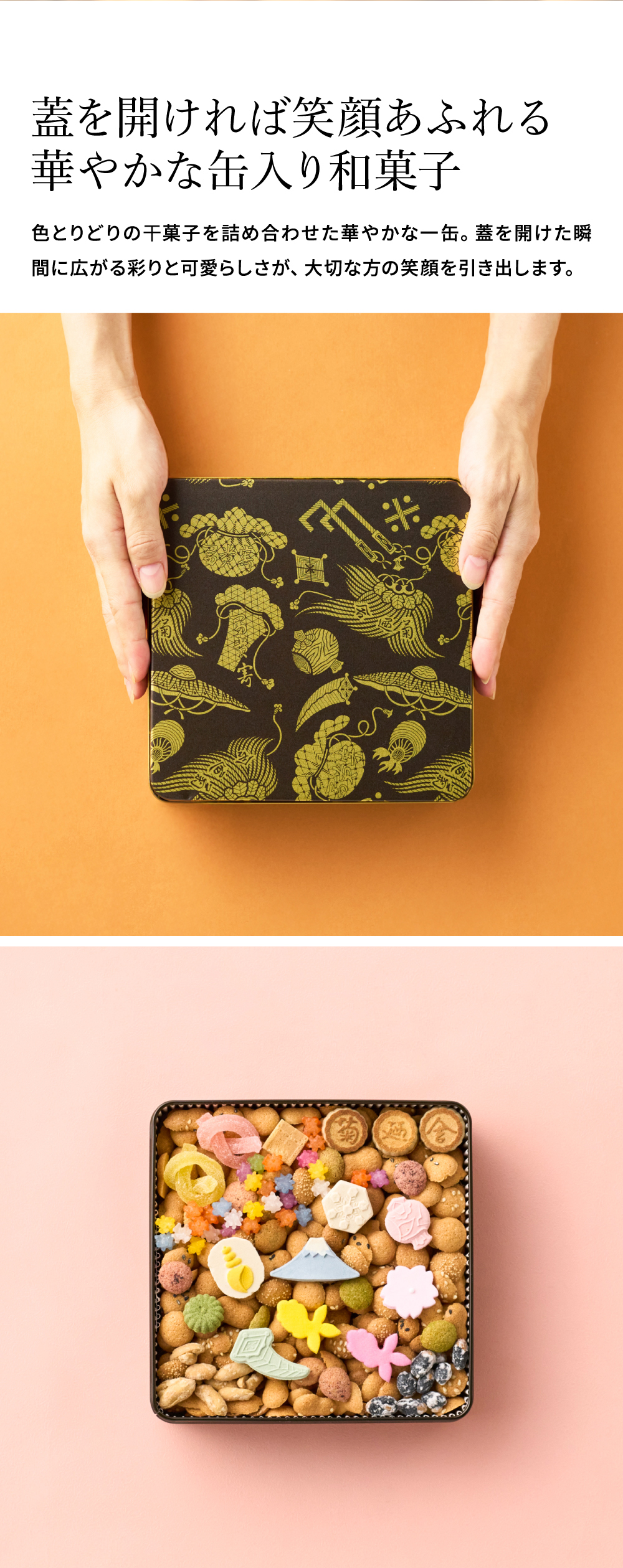 バターを使用しない和風クッキーに和三盆糖や金平糖等の干菓子が詰まった甘いお菓子です。創業百三十余年。五代目当主が描いたのは、富士の山を望む華やかな冨貴寄です。