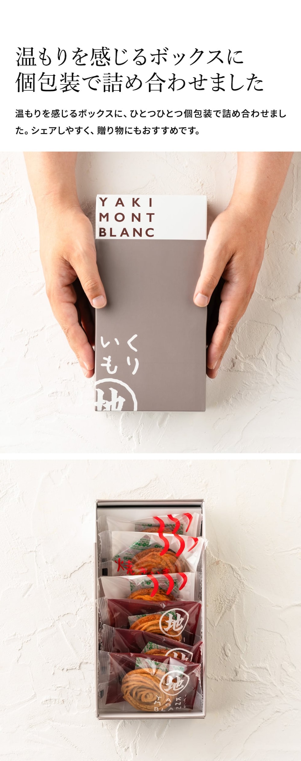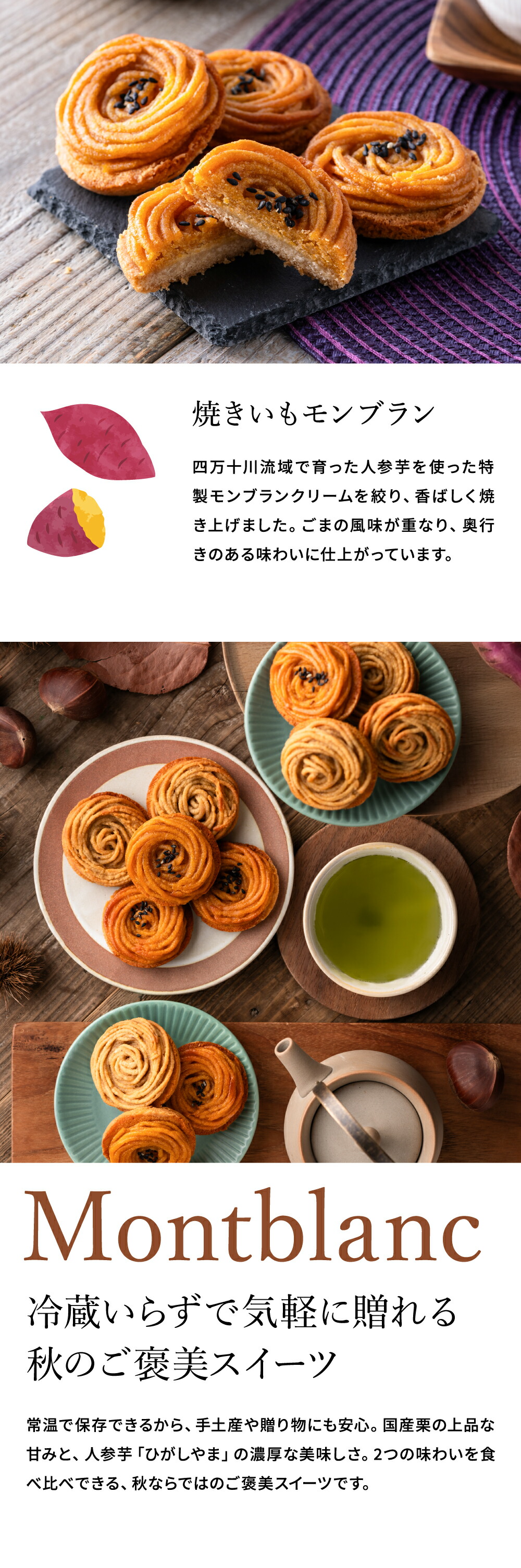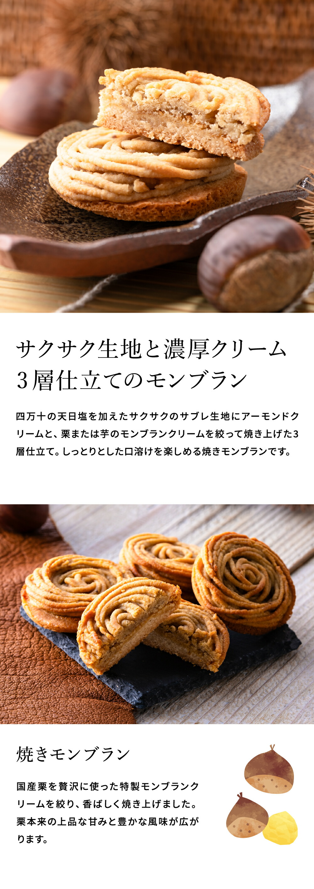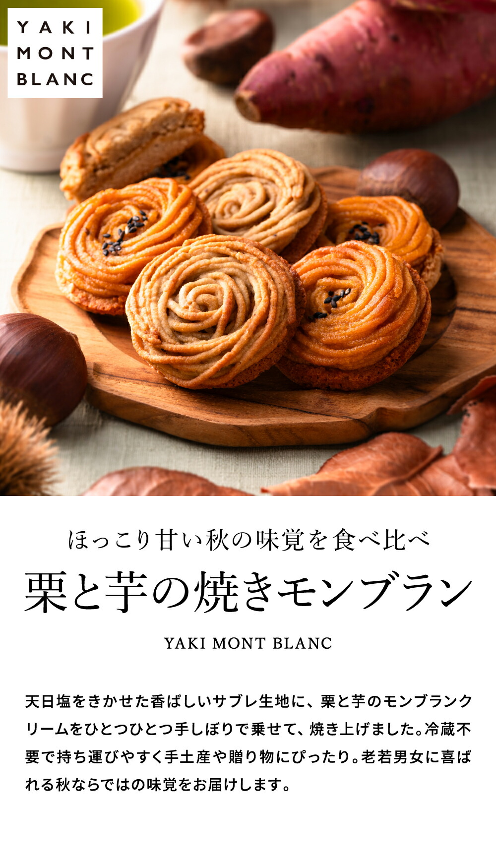 しっとり食感の山塩サブレに、栗と芋の特性モンブランクリームを手絞りして焼いた、焼きモンブランアソートの6個セットです。バターと洋酒のコクと満足感、まるでお花のような見た目の愛らしさで贈り物にも喜ばれる一品です。