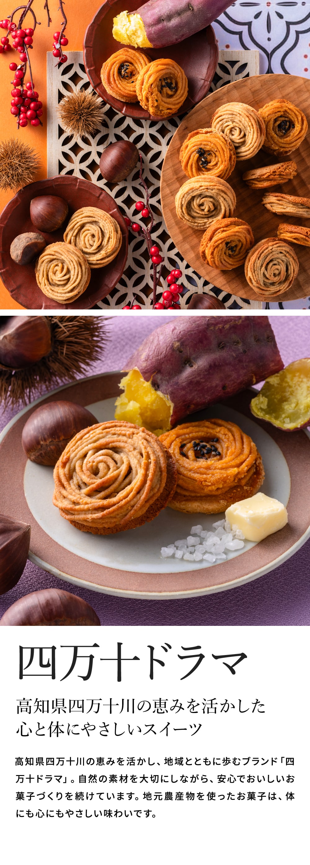●原材料:栗ペースト・芋ペースト・きび糖・白餡・バター・アーモンドプール・卵・小麦粉・生クリーム・ごま・ラム酒・ブランデー・食塩
