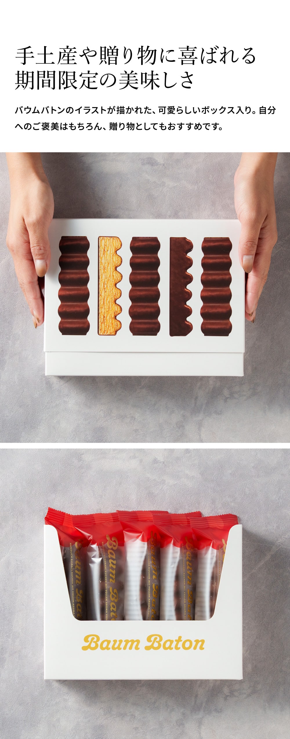 ユーハイム自慢のバター香るしっとりバウムクーヘンにオリジナルのミルクチョコレートをたっぷりとコーティング。片手で頬張るスティックタイプのバウムクーヘンです。寒い季節にぴったりの、贅沢な風味をお楽しみください。