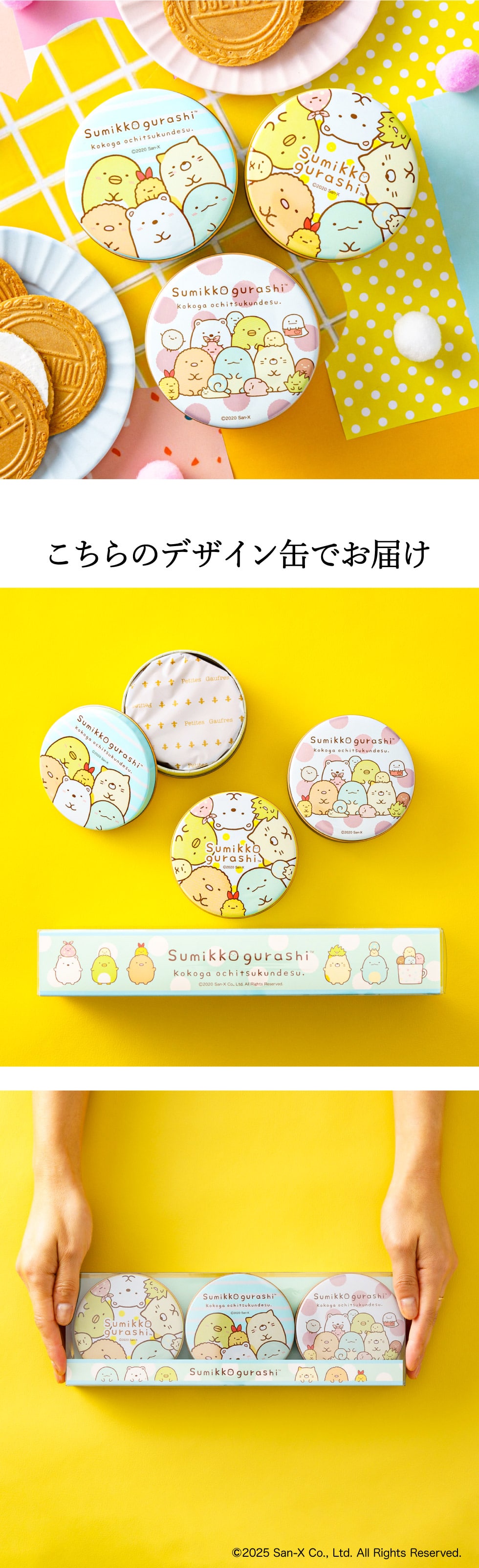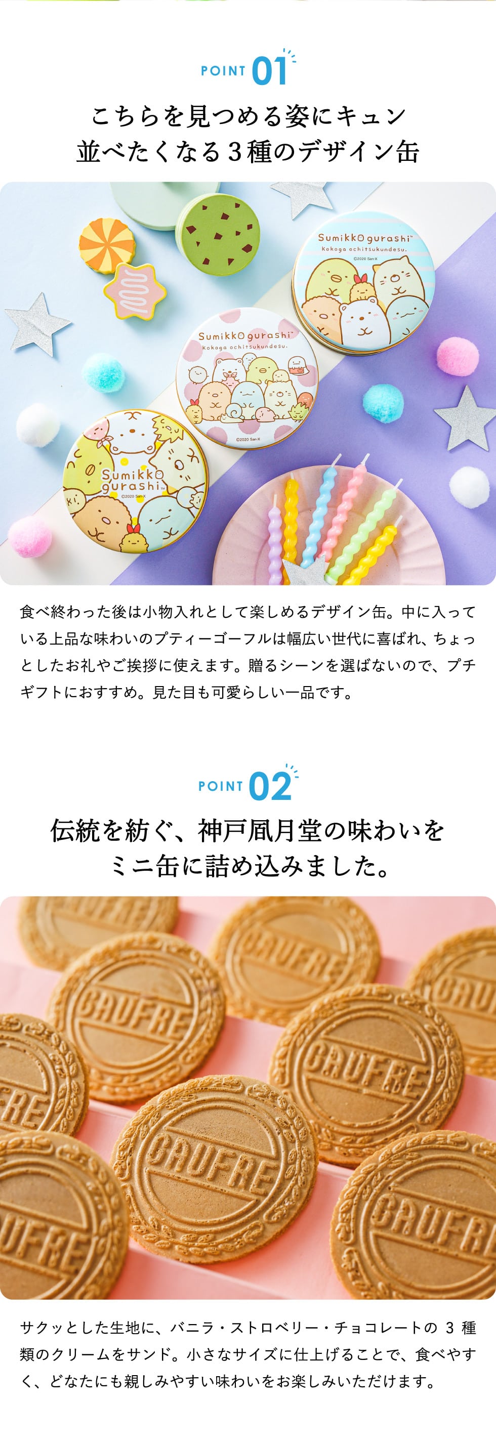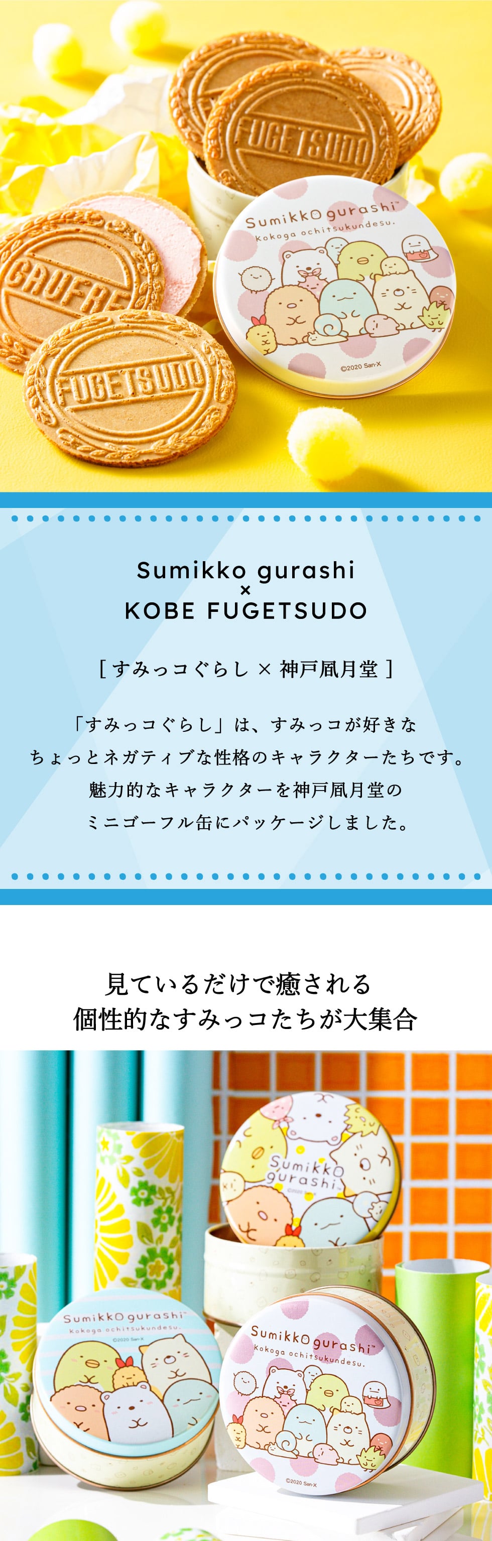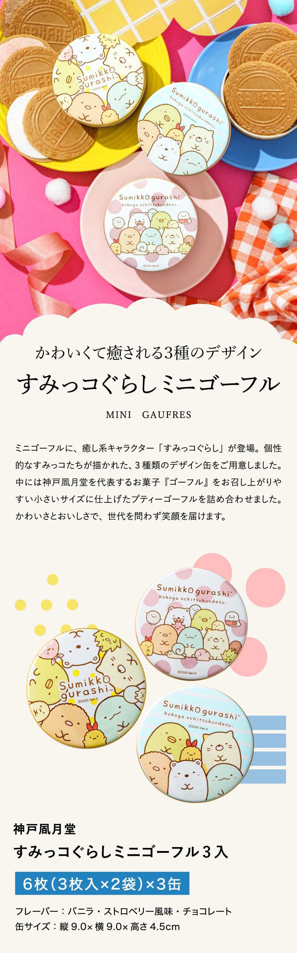 ミニゴーフルに、癒し系キャラクター「すみっコぐらし」が登場。個性的なすみっコたちが描かれた、3種類のデザイン缶をご用意しました。中には神戸風月堂を代表するお菓子『ゴーフル』をお召し上がりやすい小さいサイズに仕上げたプティーゴーフルを詰め合わせました。かわいさとおいしさで、世代を問わず笑顔を届けます。