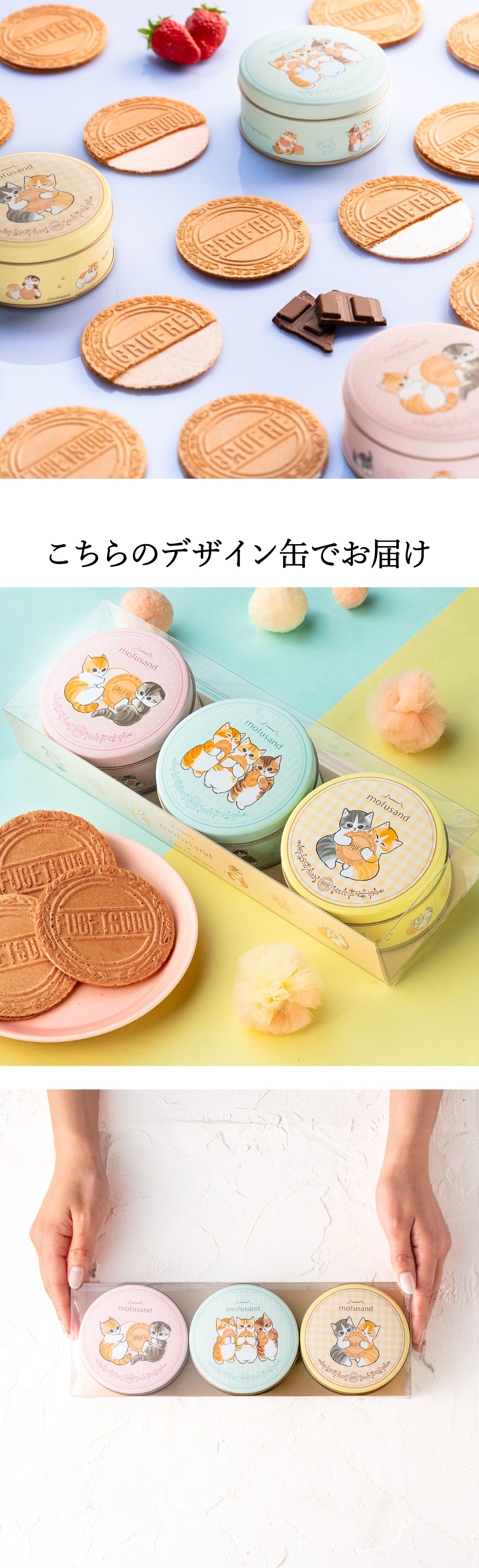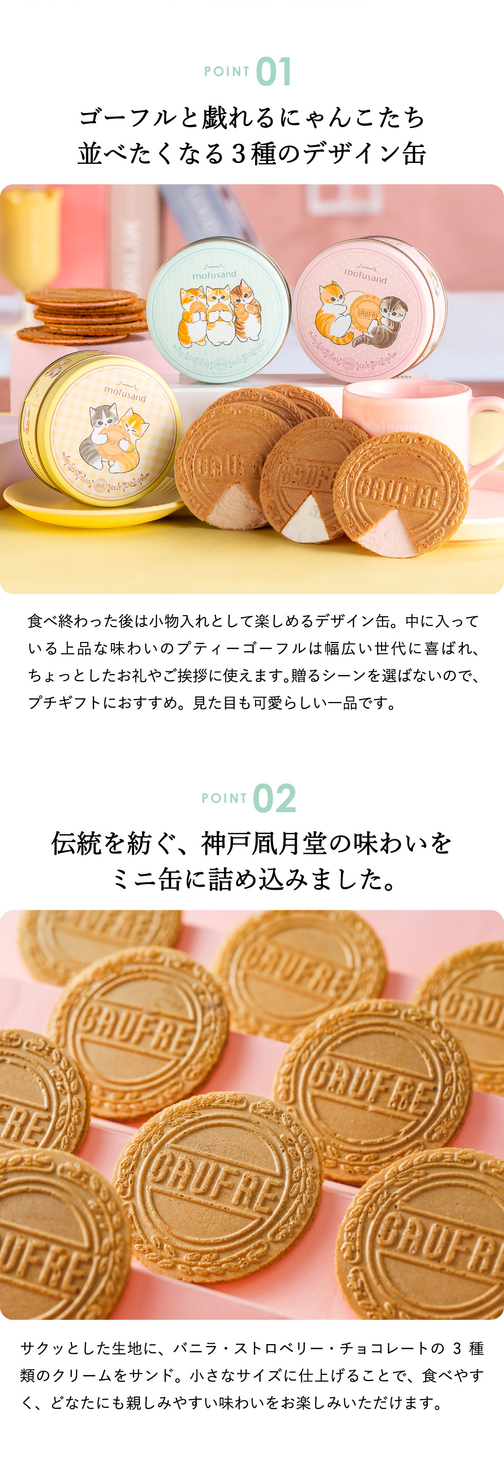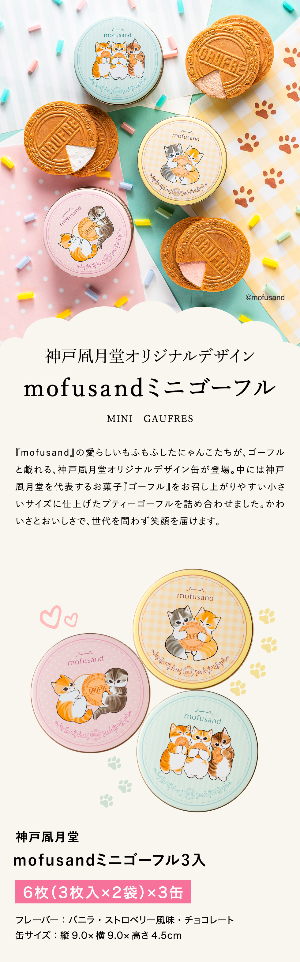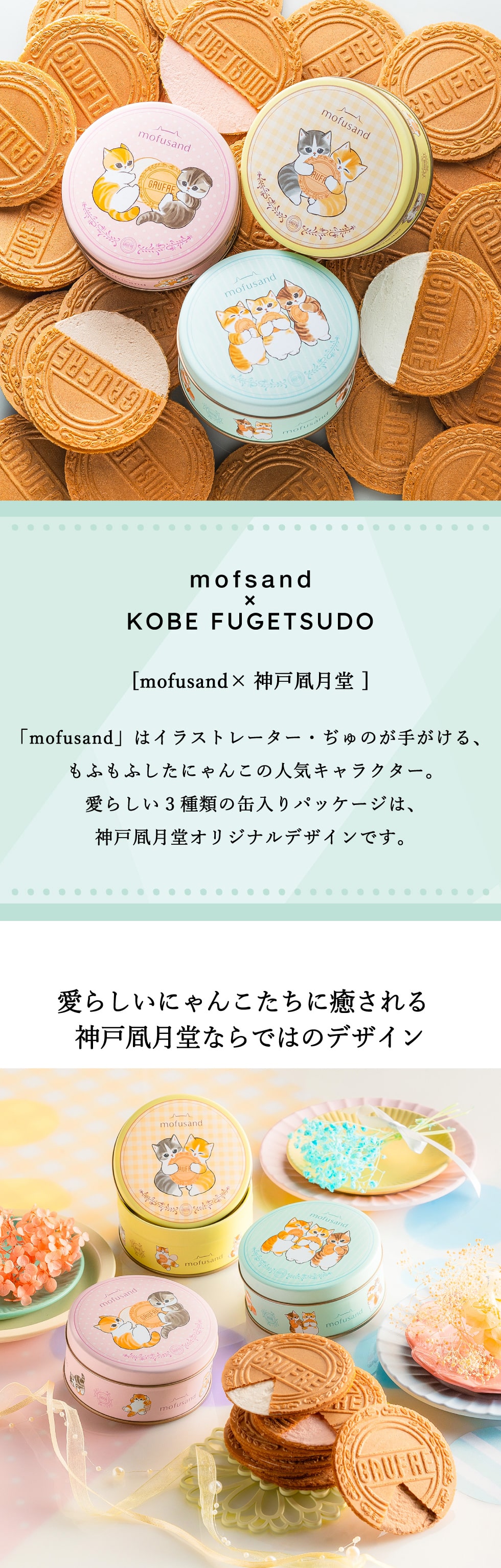 SNSで人気のイラストレーター・ぢゅの が手がける『mofusand』の もふもふにゃんこたちと、神戸風月堂のゴーフルが初めてのコラボレーション。 パステルカラーが可愛いオリジナルデザインの缶には、ゴーフルと戯れる愛らしいにゃんこたちがたくさん描かれています。 中には、サクサクと軽やかな食感の生地で、バニラ・ストロベリー風味・チョコレートの 3種のクリームをそれぞれサンドしたプティーゴーフルを詰め合わせました。 食べ終わった後の缶は小物入れとしてはもちろん、mofusandグッズとしてコレクションにもおすすめ。 mofusandファンやにゃんこ好きな方へのプレゼント、自分へのご褒美にぴったりです。