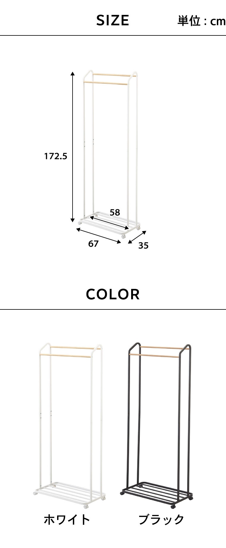 【商品サイズ】約67X35X172.5cm 【付属品】六角レンチ・スパナ 【重量】(約)5.4kg 【素材・材質】本体:スチール(粉体塗装) バー:天然木 キャスター:ナイロン 【箱サイズ】(約)横86×奥行き37×高さ8cm ●JANコード:4903208035163 4903208035170