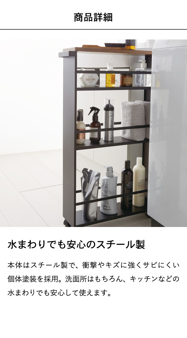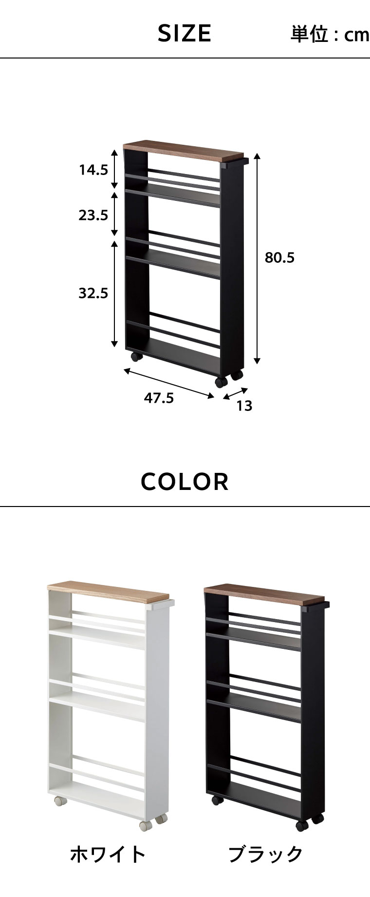【商品サイズ】約13X47.5X80.5cm 【付属品】スパナ 【重量】(約)4.7kg 【素材・材質】本体:スチール(粉体塗装) 天板:天然木化粧繊維板(ラッカー塗装) キャスター:ナイロン樹脂 【箱サイズ】(約)横49×奥行き15×高さ80cm ●JANコード:4903208036276 4903208036283