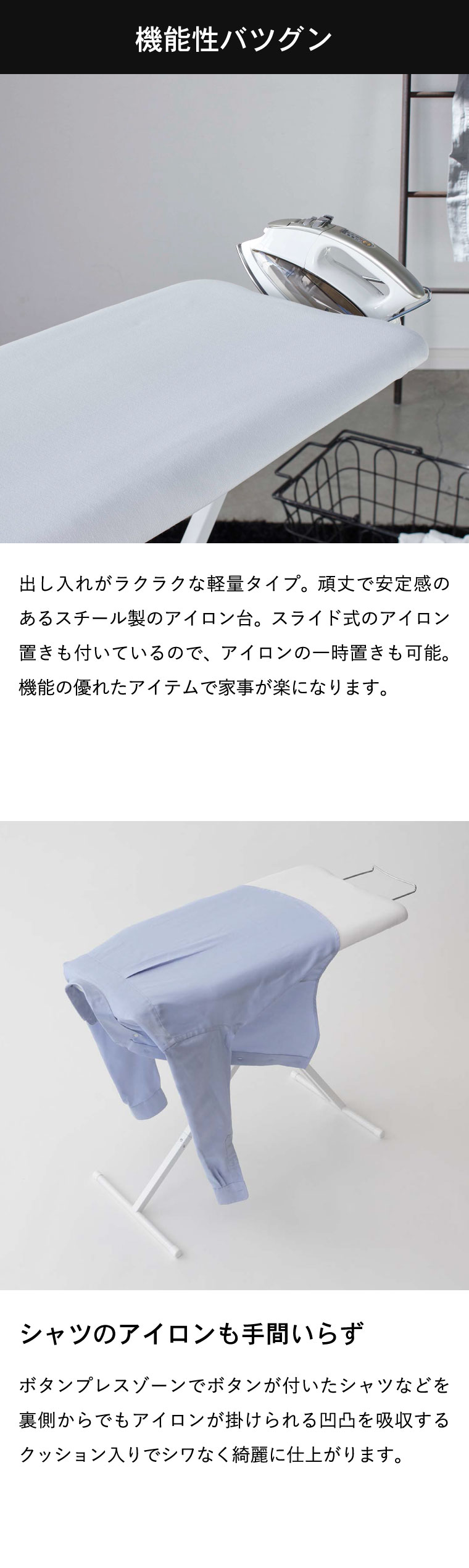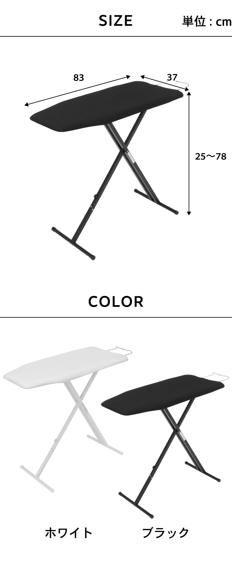 【素材・材質】表面布:綿100% クッション材:ポリエステル 天板・脚部:スチール(粉体塗装) ボタンプレスゾーン(凹凸吸収クッション):ポリウレタンフォーム アイロン置き台:スチール(クロームメッキ) キャップ:ポリエチレン