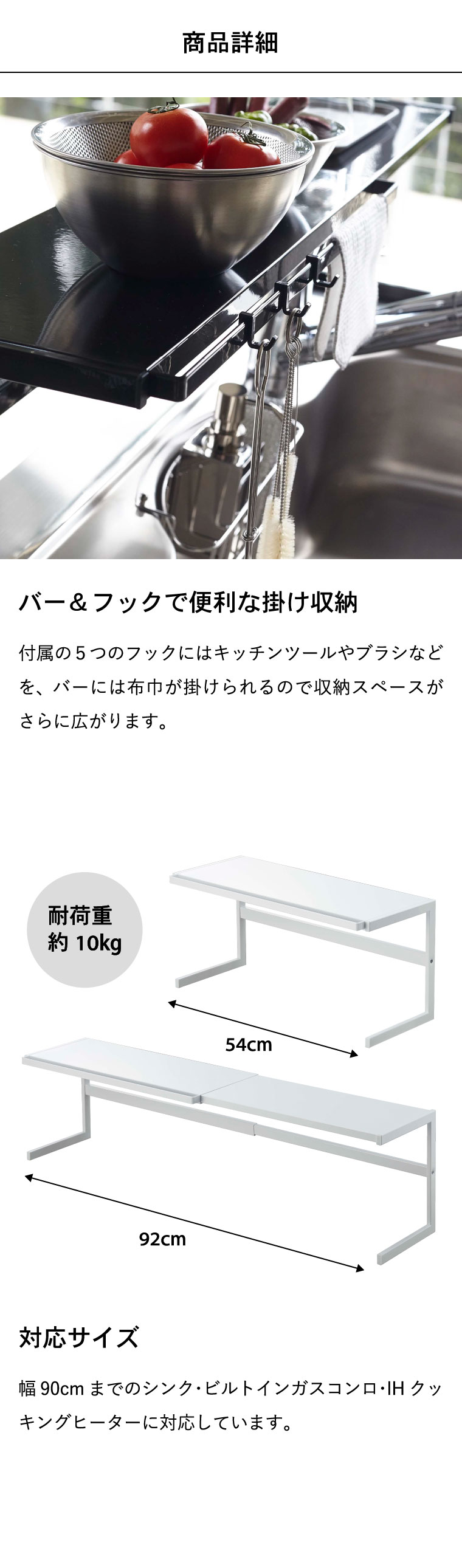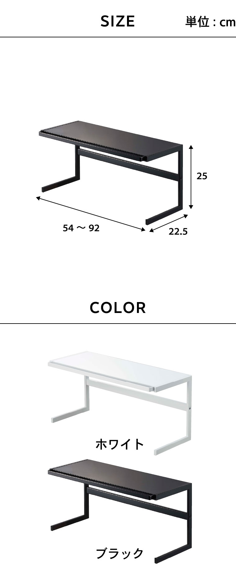 【商品サイズ】約54~92X22.5X25cm 【付属品】六角レンチ フック×5 【重量】(約)3.1kg 【素材・材質】本体:スチール(粉体塗装) 【箱サイズ】(約)横57×奥行き5×高さ27.5cm ●JANコード:4903208044806 4903208044813