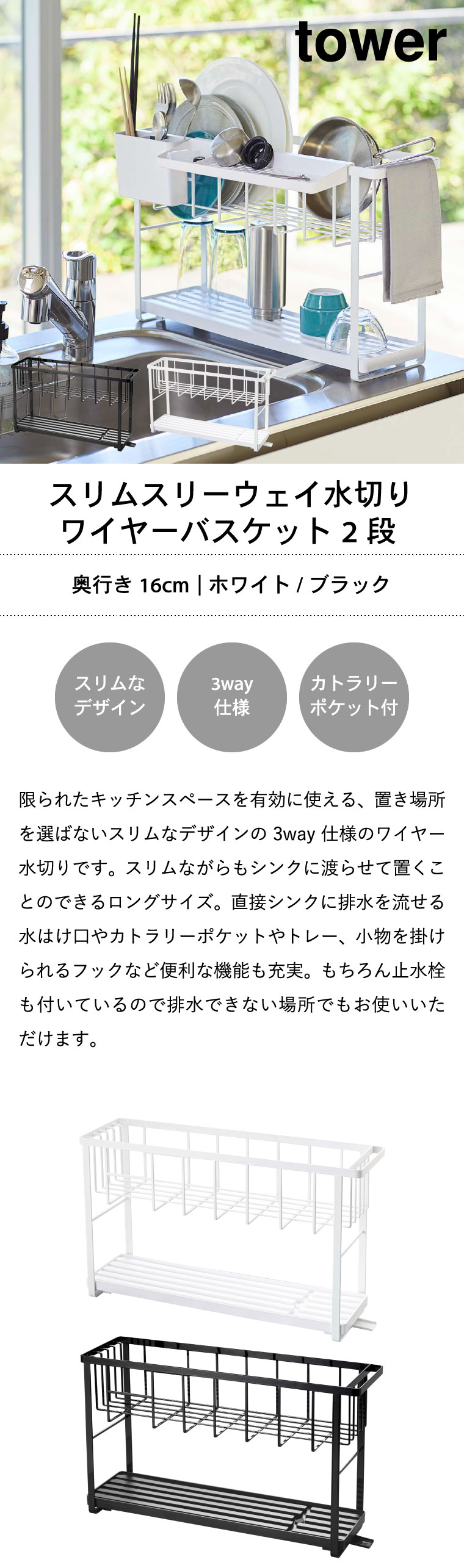 スリムスリーウェイ水切りワイヤーバスケット 2段 tower タワー
