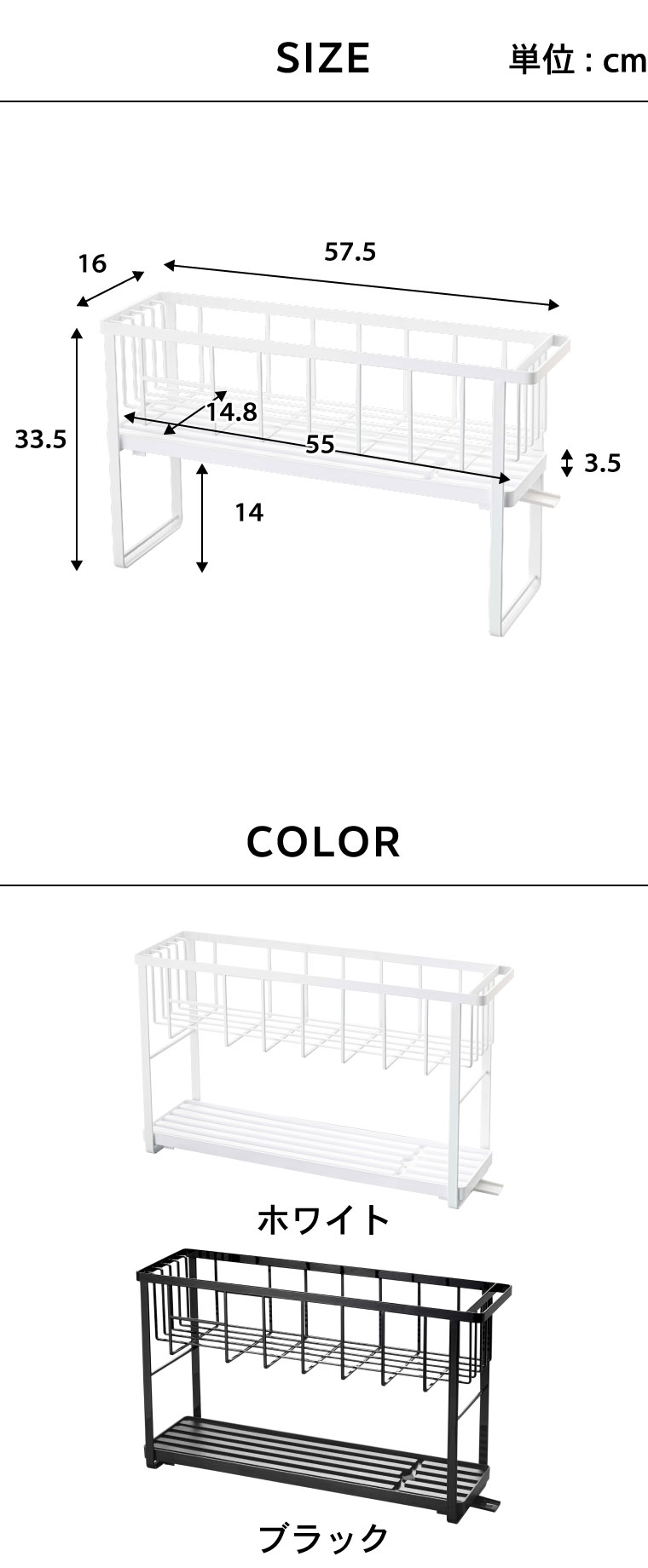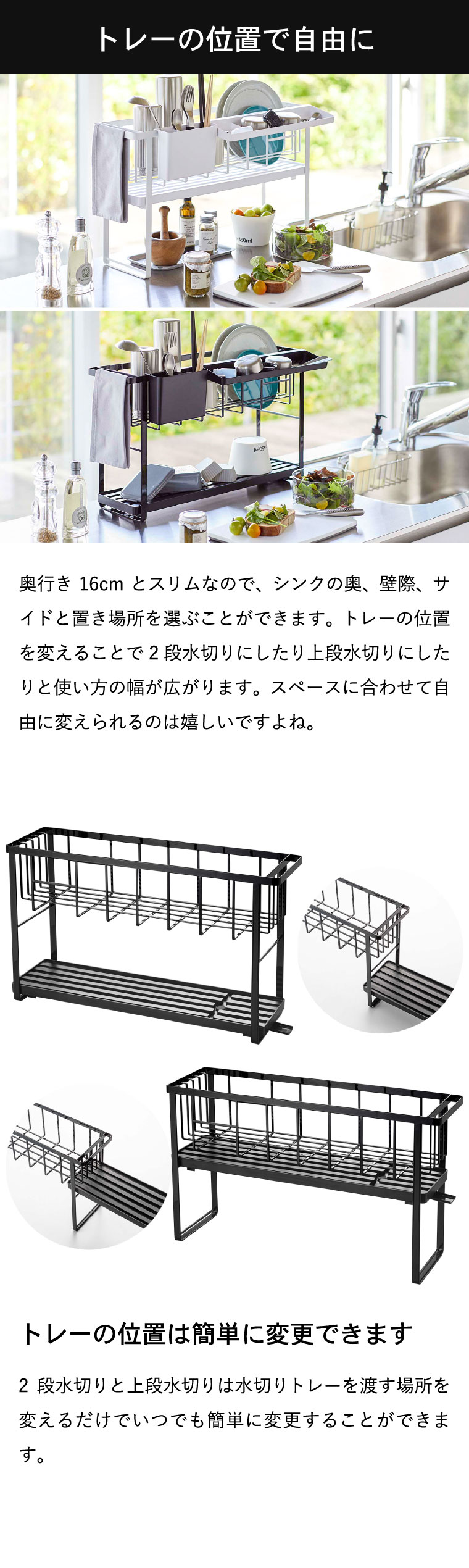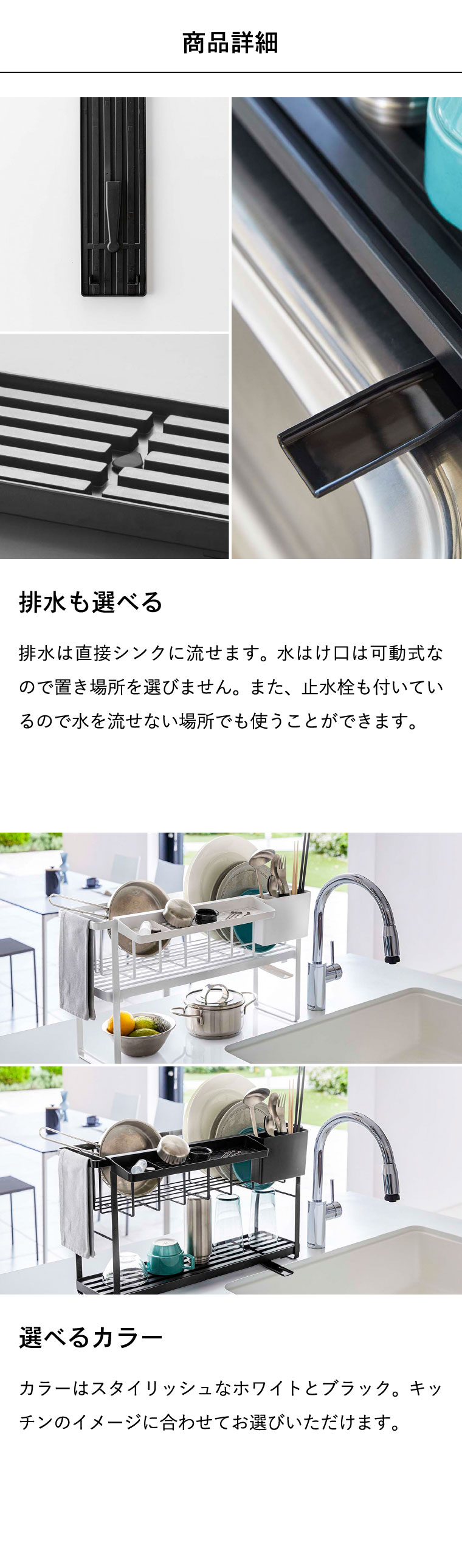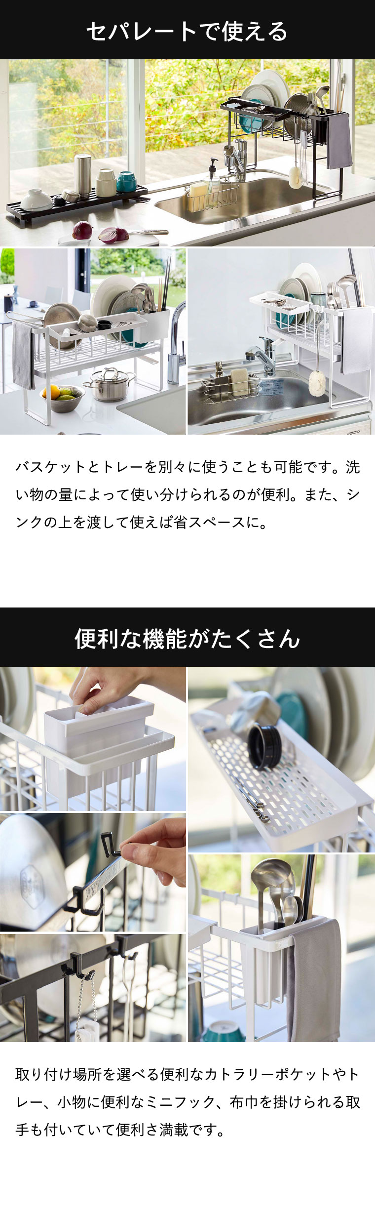【素材・材質】ワイヤーバスケット:スチール(ユニクロメッキ+粉体塗装) 水切りトレー・カトラリーポケット・カトラリートレー・フック:ABS樹脂 水はけ:ポリプロピレン 水止栓:シリコーン