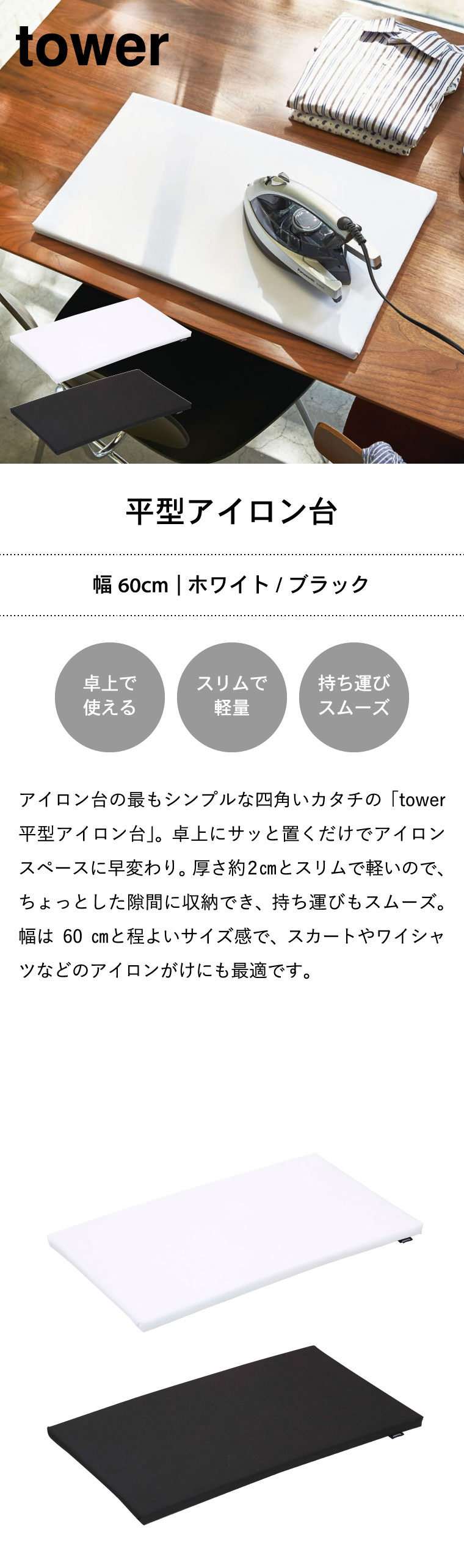 平型アイロン台 タワー 山崎実業 tower ホワイト/ブラック 卓上 コンパクト 四角 約60×36cm 1227 1228 タワーシリーズ