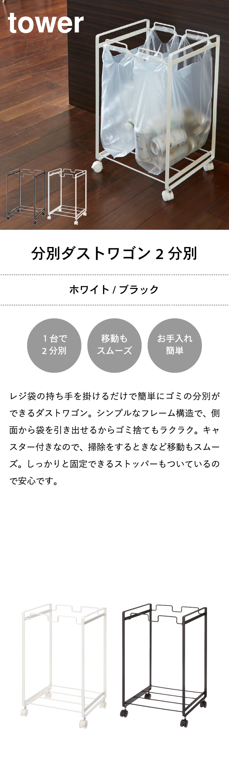 分別ダストワゴン 2分別 タワー 山崎実業 tower ゴミ箱 ホワイト/ブラック 2274 2275 タワーシリーズ