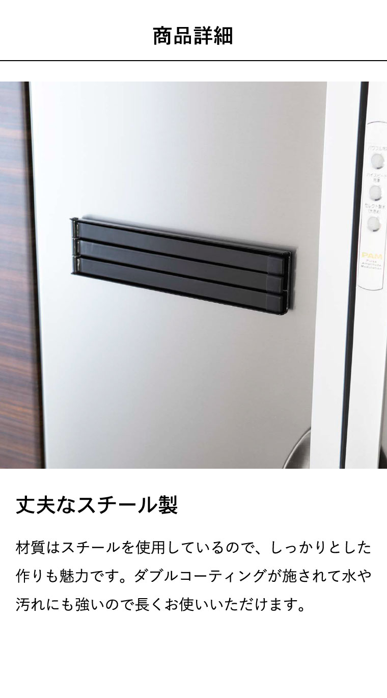 ●素材・材質:本体:スチール(ユニクロメッキ+粉体塗装) キャップ:シリコーン マグネット ●商品サイズ:(約)横24×奥行き1×高さ6cm ●商品重量:(約)450g ●型番:KT-TW BG WH/KT-TW BG BK ●JANコード:4903208024563 4903208024570