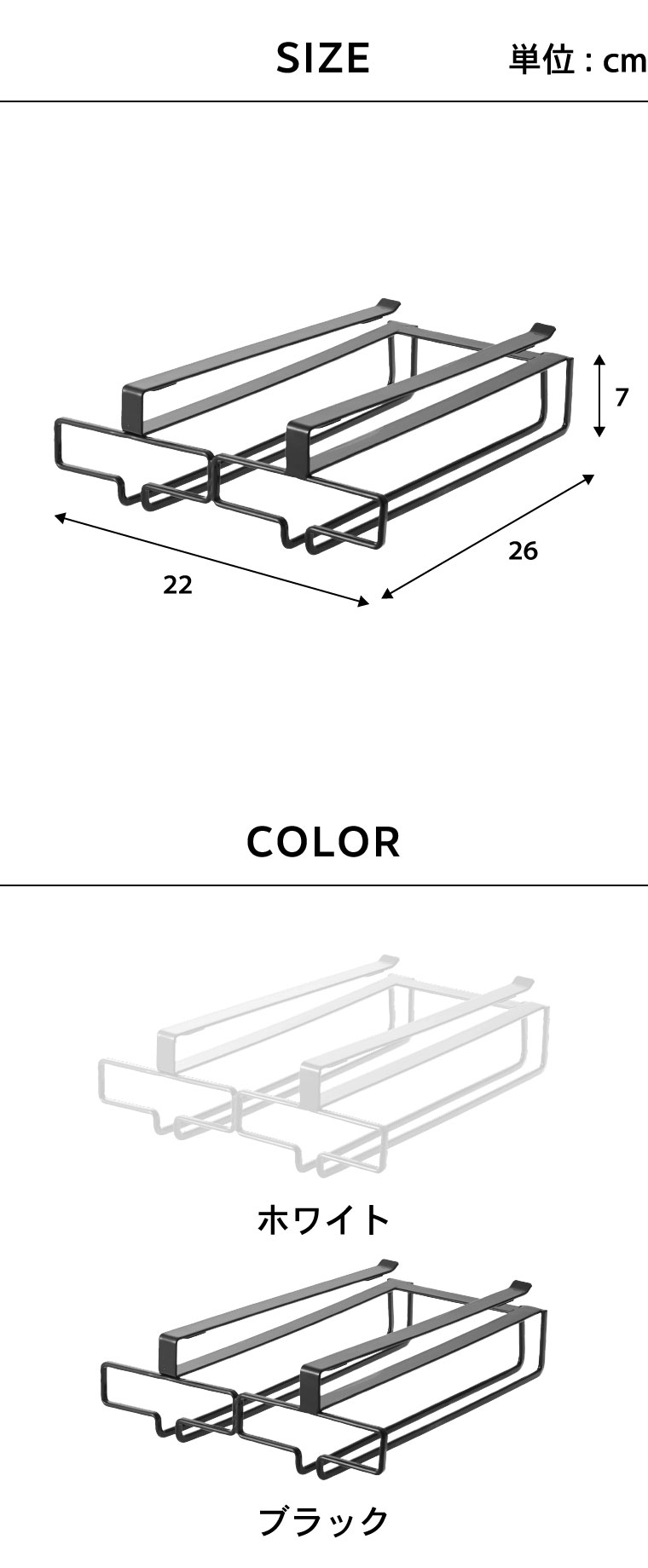 ●対応サイズ:棚板の厚さ約1.4~2cmまでに対応 ●素材・材質:本体:スチール(粉体塗装) ●商品サイズ:(約)横22×奥行き26×高さ7cm ●商品重量:(約)470g ●型番:KT-TW BK WH/KT-TW BK BK ●JANコード:4903208024648 4903208024655