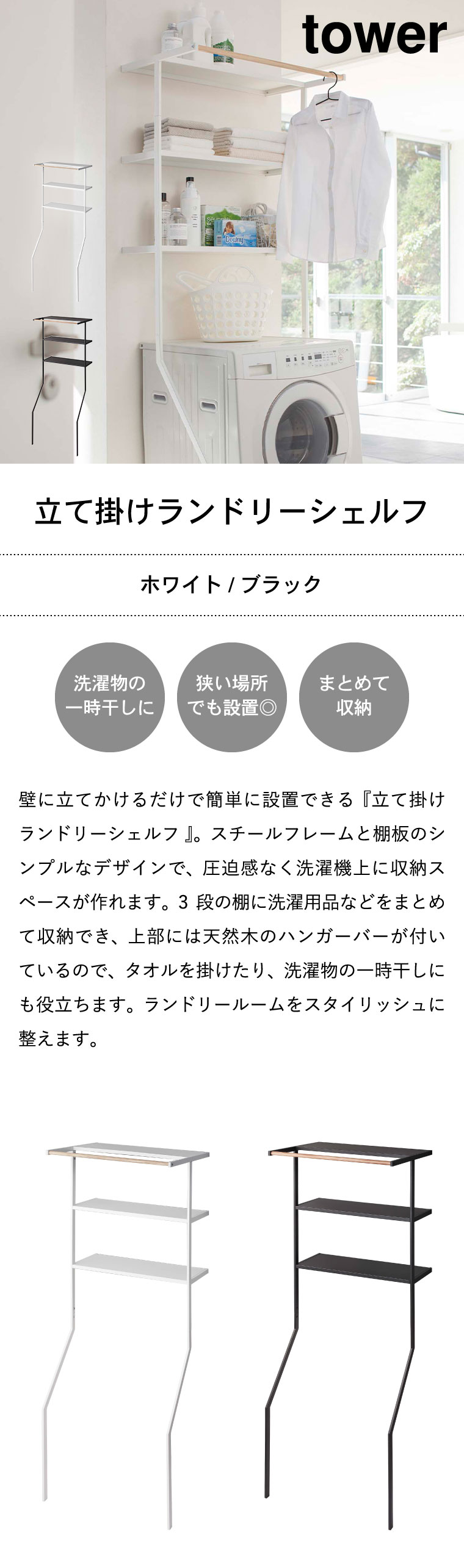 立て掛けランドリーシェルフ タワー 山崎実業 tower ホワイト/ブラック 2482 2483