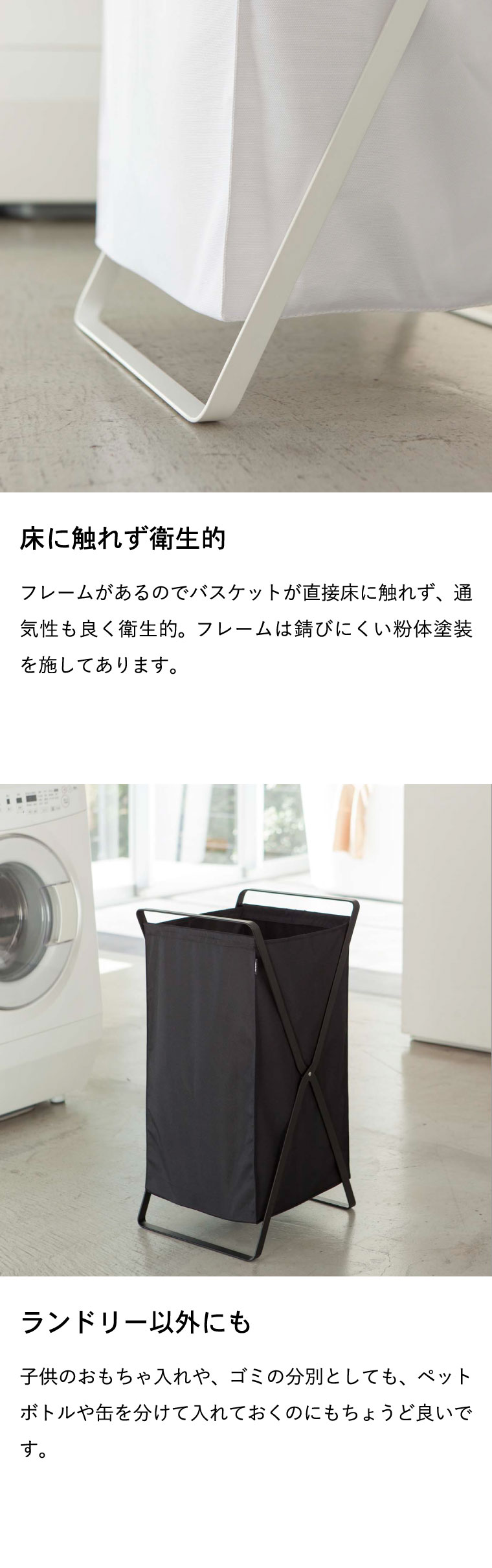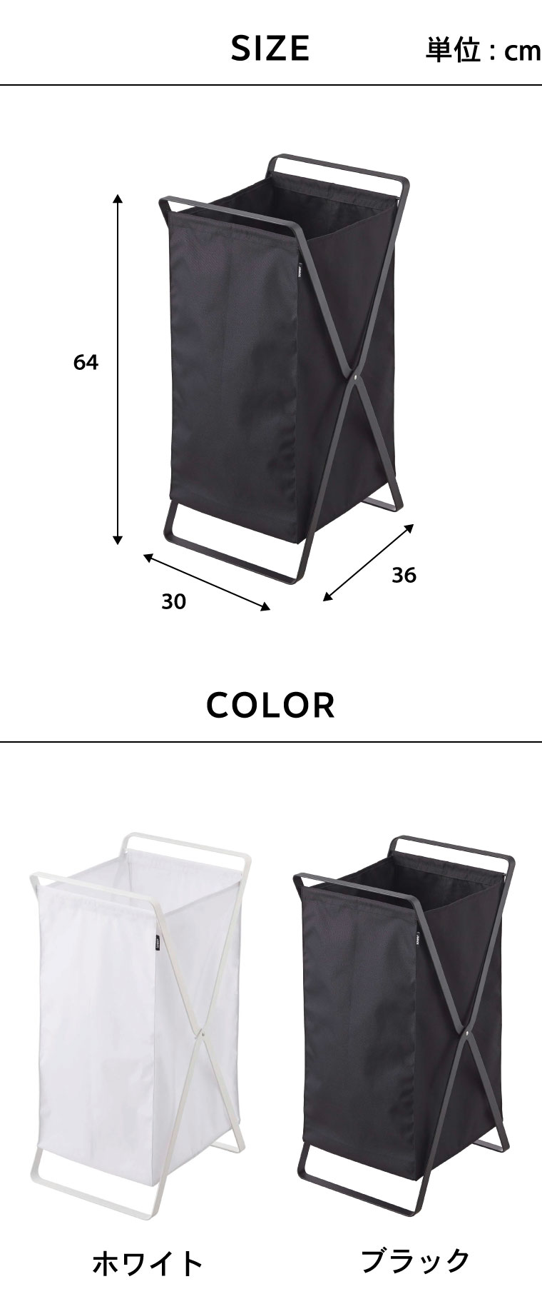 ●素材・材質:フレーム:スチール(粉体塗装) バスケット:ポリエステル100% 底板:ポリプロピレン ●商品サイズ:(約)横30×奥行き36×高さ64cm ●商品重量:(約)2300g ●型番:LD-J WH/LD-J BK ●JANコード:4903208024846 4903208024853