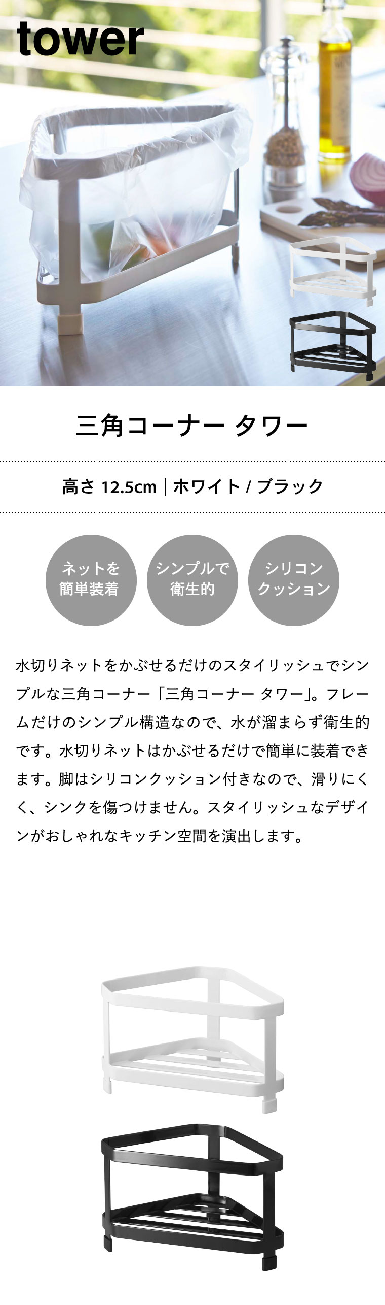 三角コーナー タワー 山崎実業 tower ゴミ箱 ホワイト/ブラック 2791 2792 タワーシリーズ