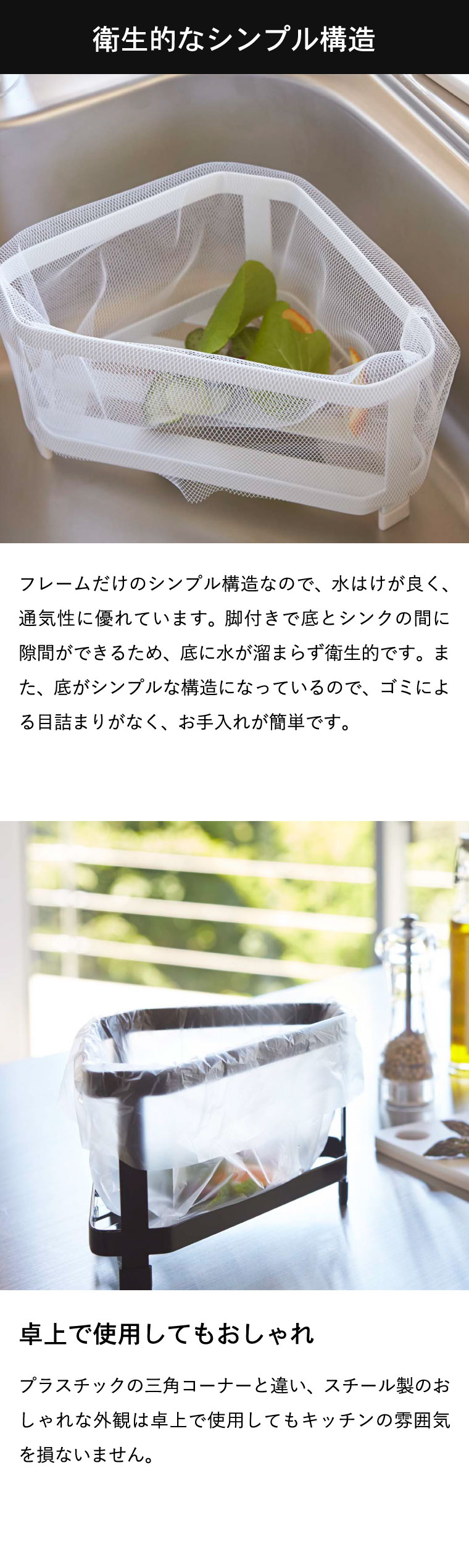 ●対応サイズ:約W28×H20cm以上の三角コーナー用水切りネット・ポリ袋に対応