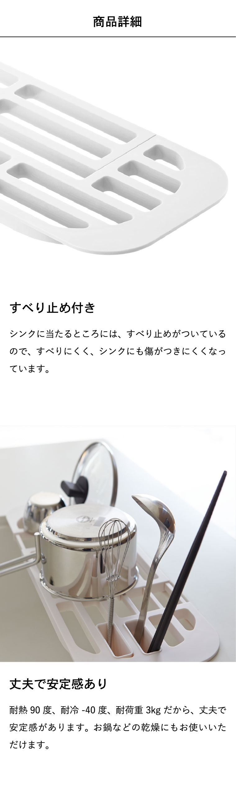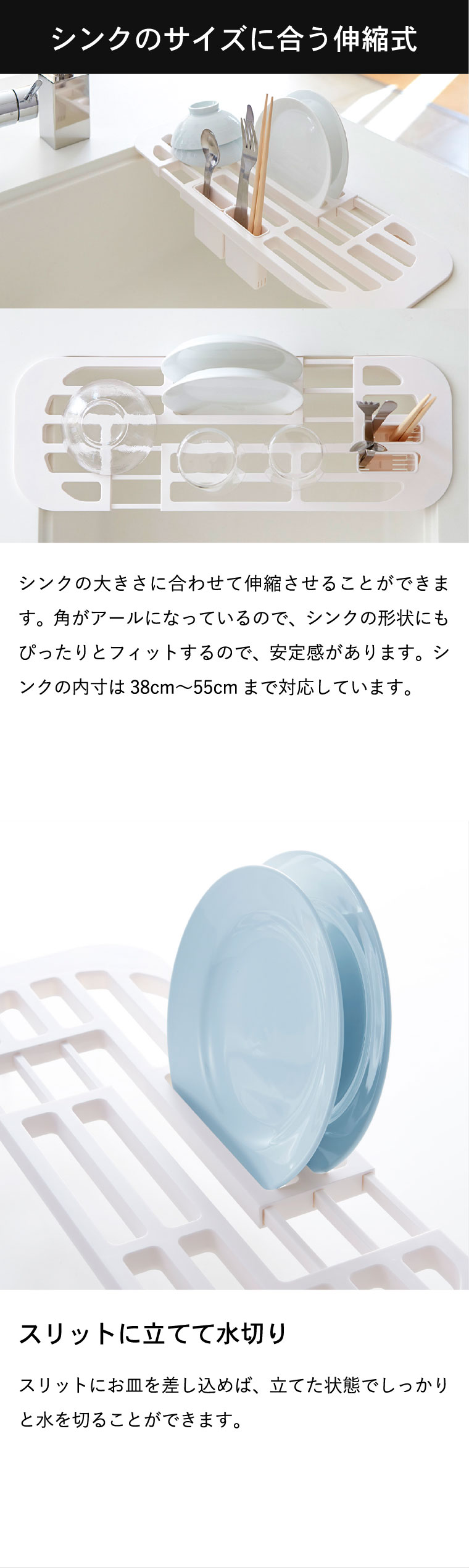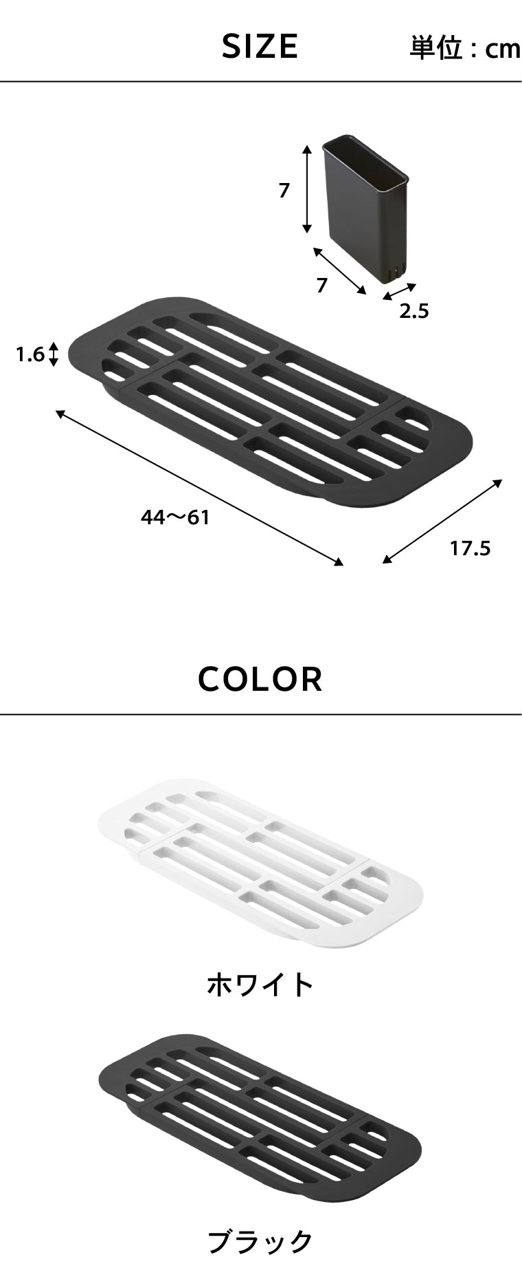 ●対応サイズ:シンク内寸:約38~55cmまで ●素材・材質:本体:ABS樹脂 ●商品サイズ:(約)横44~61×奥行き17.5×高さ1.6cm ●商品重量:(約)475g ●型番:KT-TW CR WH/KT-TW CR BK ●JANコード:4903208028738 4903208028745