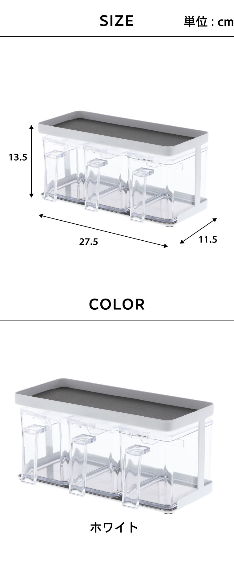 ●素材・材質:ラック(フレーム:スチール(粉体塗装) マット:合成ゴム) 調味料ストッカー(容器・スプーン・蓋・すり切り板):PS樹脂