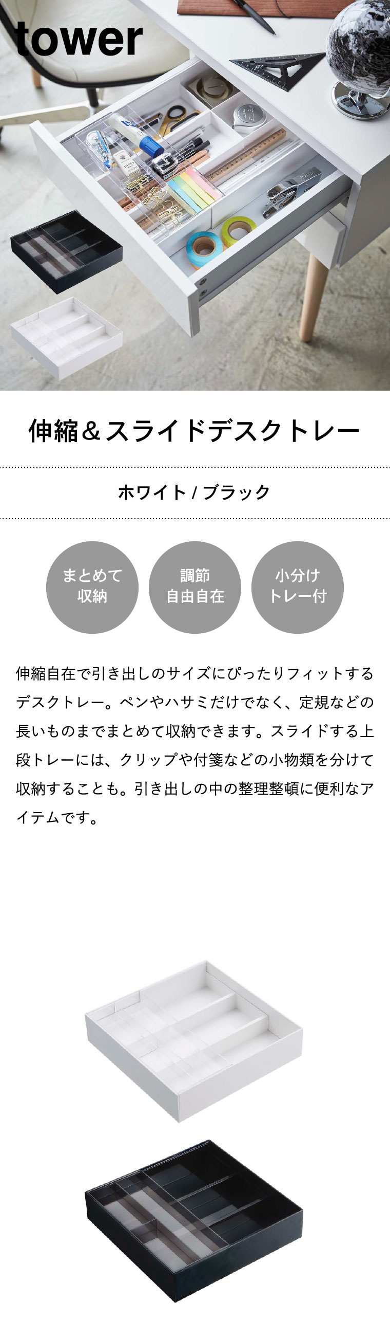 ●対応サイズ:幅・奥行約25~45cm以上 高さ約6cm以上の引き出し(内寸) ●素材・材質:本体:ABS樹脂 上段トレー:PS樹脂 ●商品サイズ:(約)横25×奥行き24.6~45×高さ5.7cm ●商品重量:(約)750g ●型番:ZK-TW D WH ●JANコード:4903208034418 4903208034425
