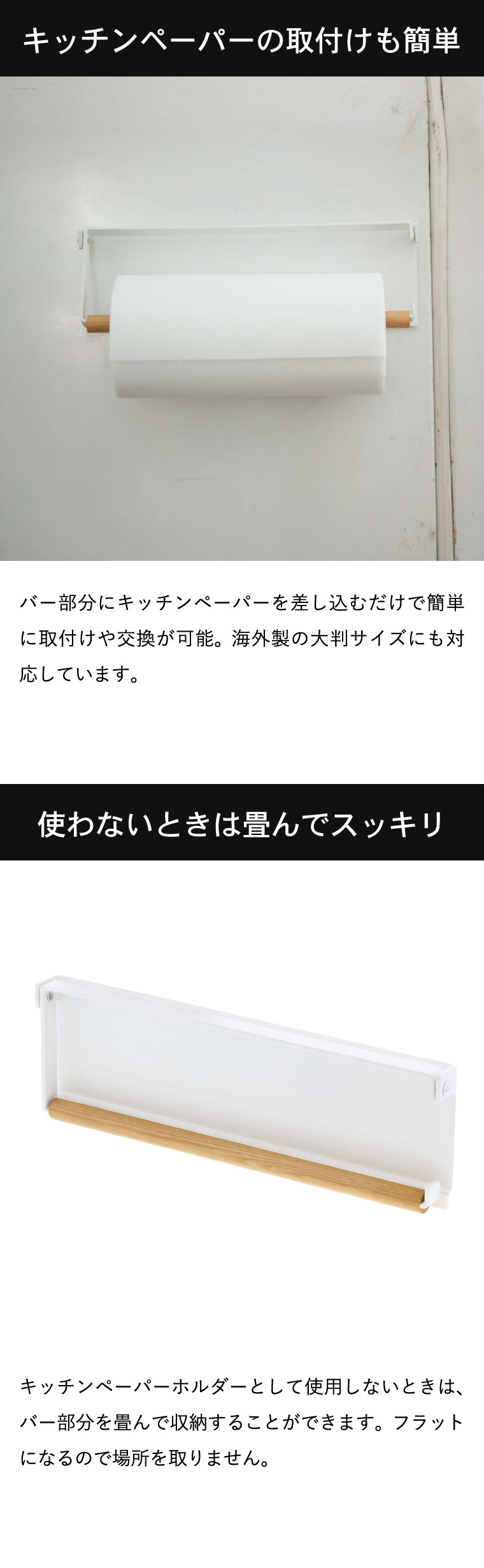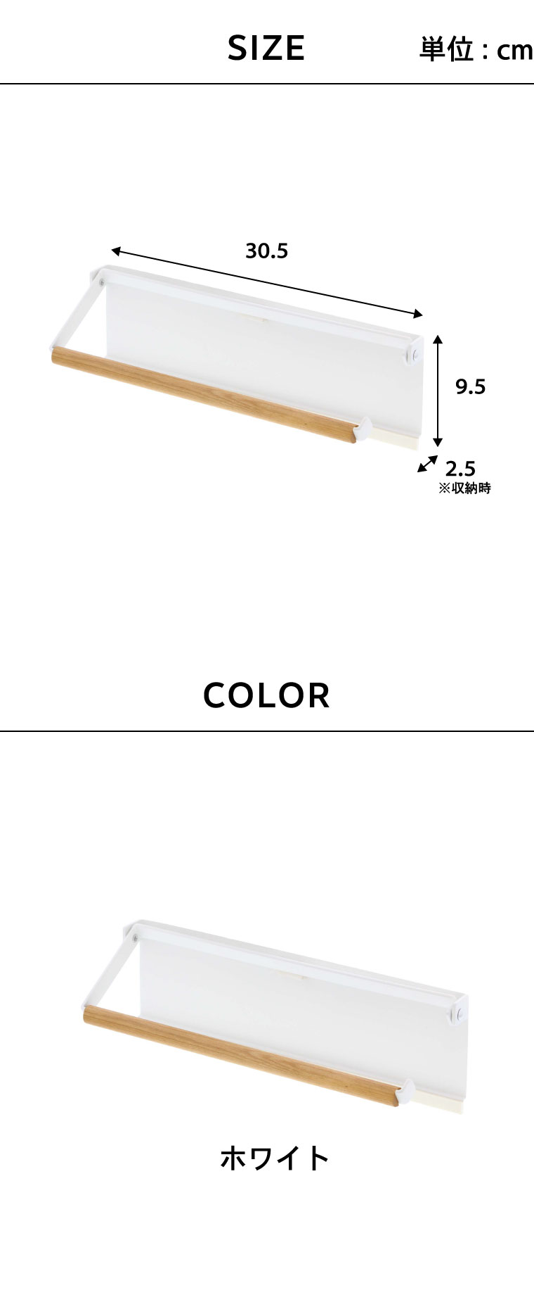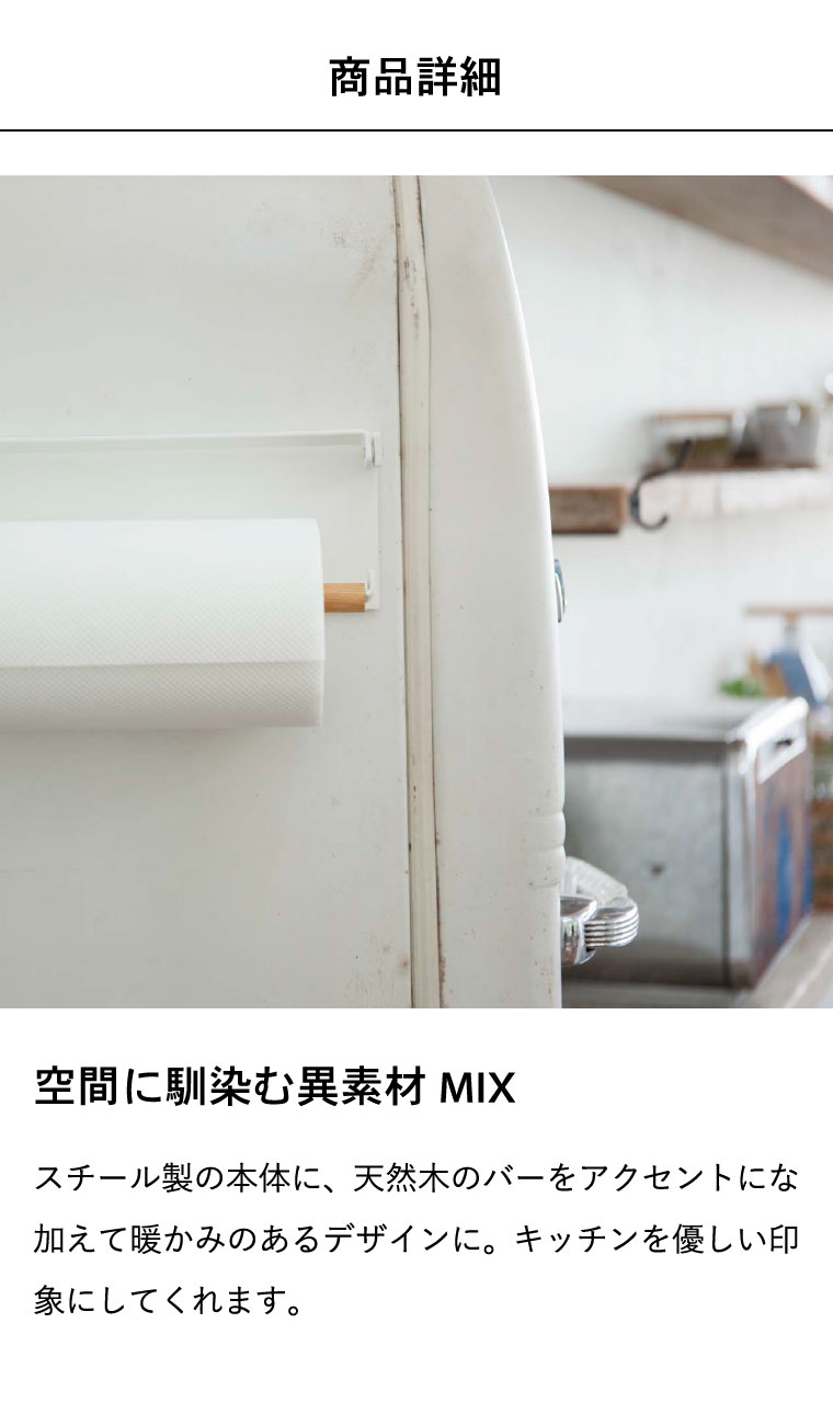 ●対応サイズ:直径約15cm、約高さ28cmのまでのキッチンペーパーロール ●素材・材質:本体:スチール (粉体塗装) バー:天然木 ストッパー:シリコーン マグネット ●商品サイズ:(約)横30.5×奥行き2.5×高さ9.5cm ●商品重量:(約)670g ●型番:KT-PW BG WH ●JANコード:4903208035309