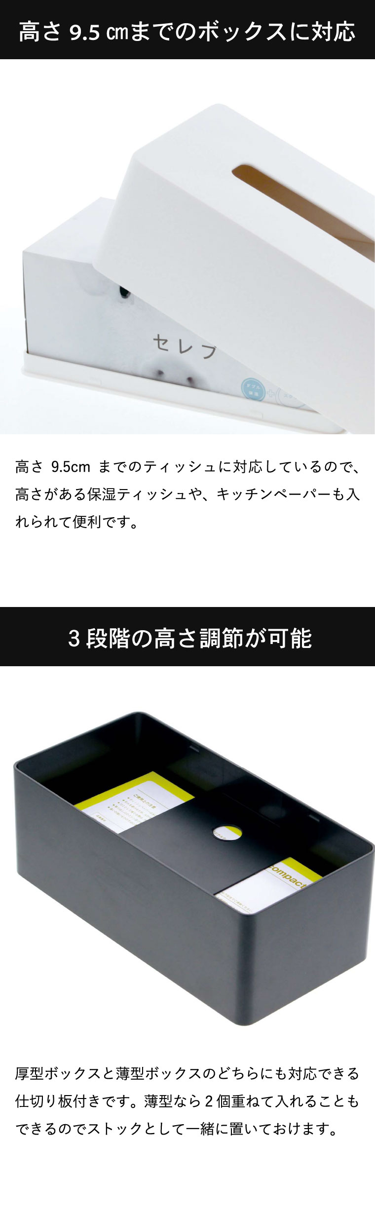 ●対応サイズ:高さ約9.5cmまでのティッシュボックス
