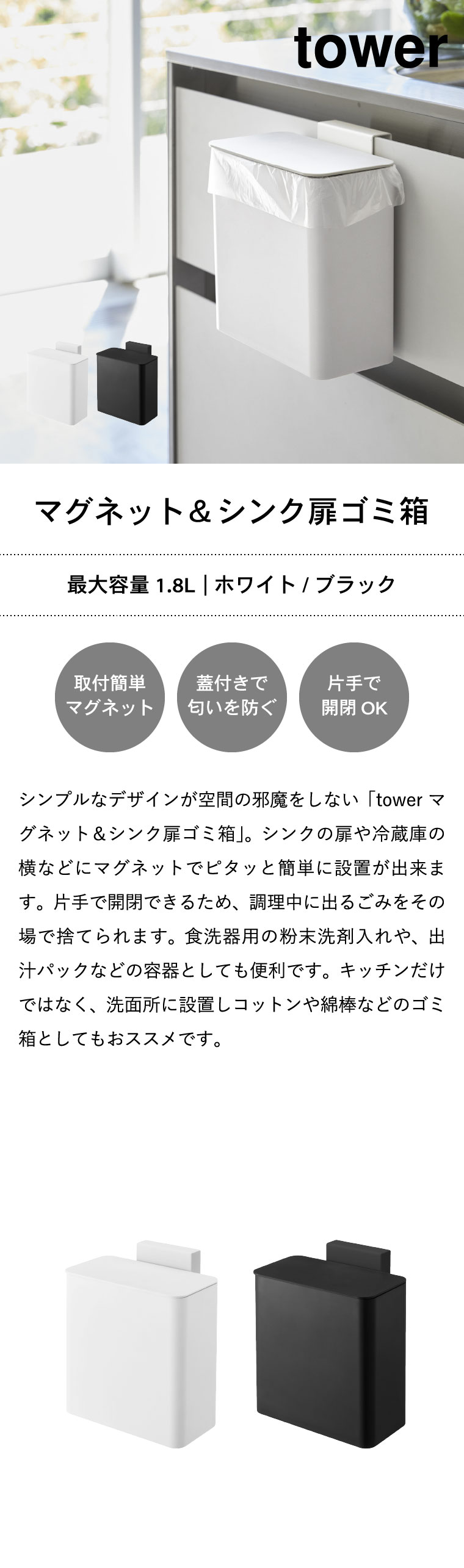 マグネット&シンク扉ゴミ箱 タワー 山崎実業 tower ホワイト/ブラック 4268 4269 タワーシリーズ マグネット