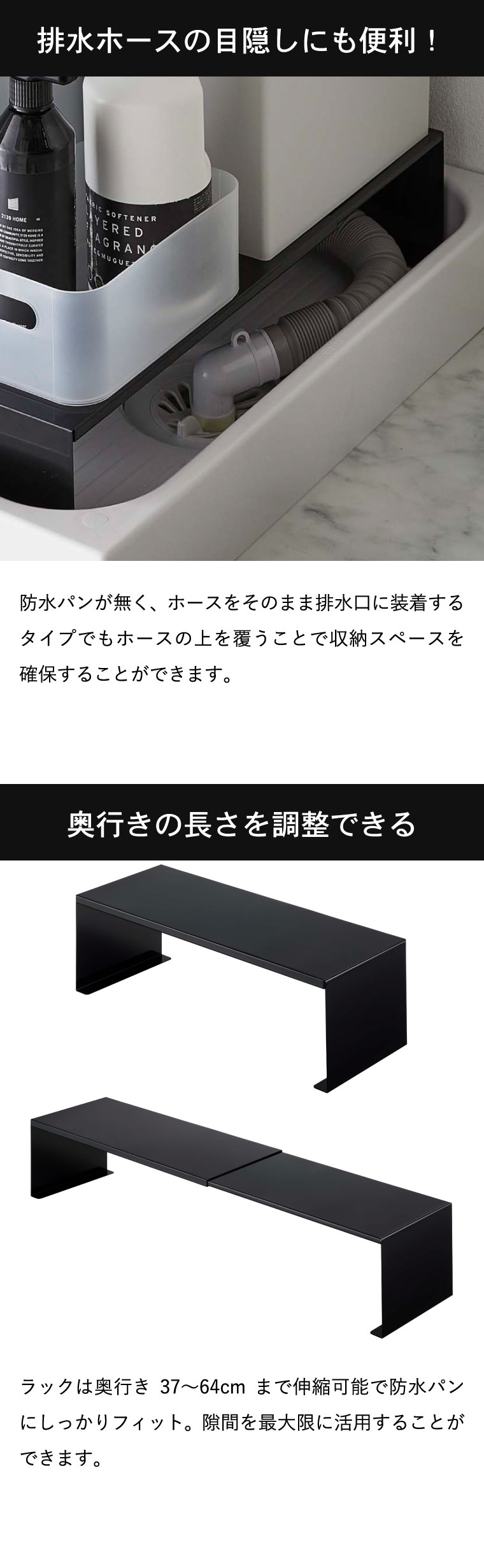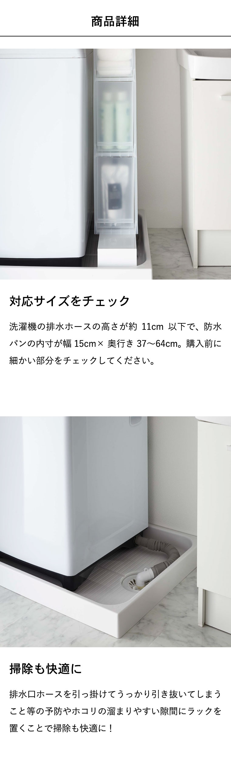 ●対応サイズ:洗濯機排水ホース(高さ):約11cm以下 防水パン(洗濯機を設置時)有効内寸:約W15×D37~64cm
