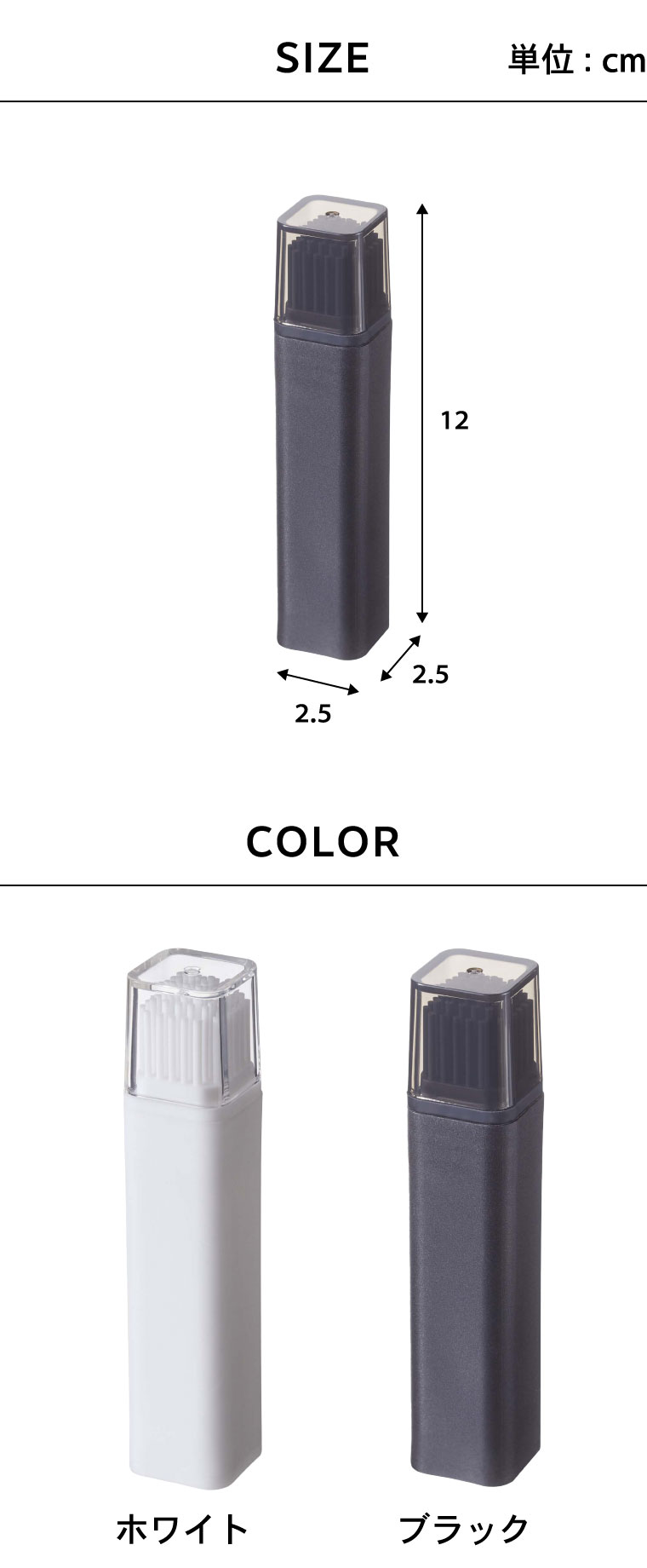 ●素材・材質:本体 : ポリプロピレン ブラシ : シリコーン 蓋 : アクリル樹脂 ●商品サイズ:(約)横2.5×奥行き2.5×高さ12cm ●商品重量:(約)38g ●JANコード:4903208043540 4903208043557
