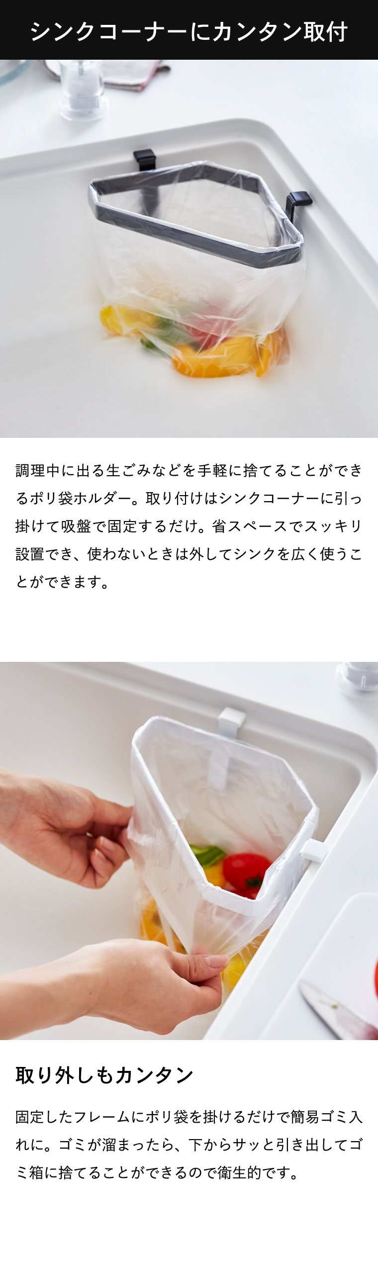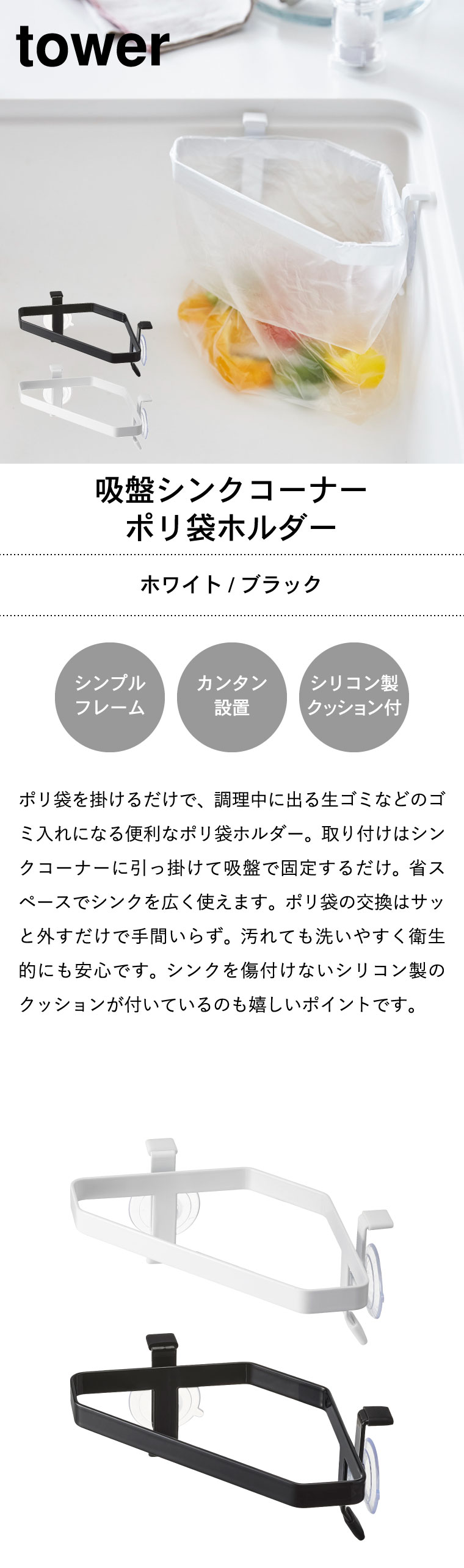 吸盤シンクコーナーポリ袋ホルダー タワー 山崎実業 tower ホワイト/ブラック 4750 4751 タワーシリーズ