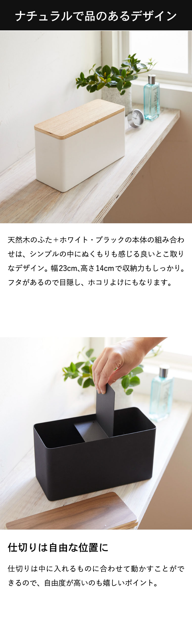 ●素材・材質:本体・仕切り板:スチール(粉体塗装) 蓋:天然木積層合板(ラッカー塗装) ●商品サイズ:(約)横23×奥行き10.5×高さ14cm ●商品重量:(約)1100g ●JANコード:4903208048071 4903208048088