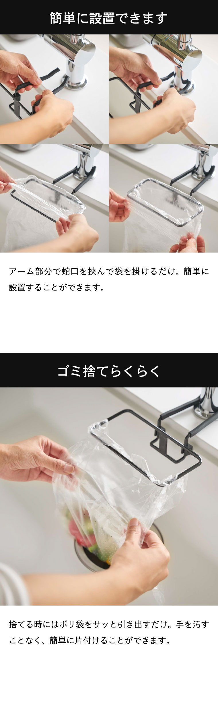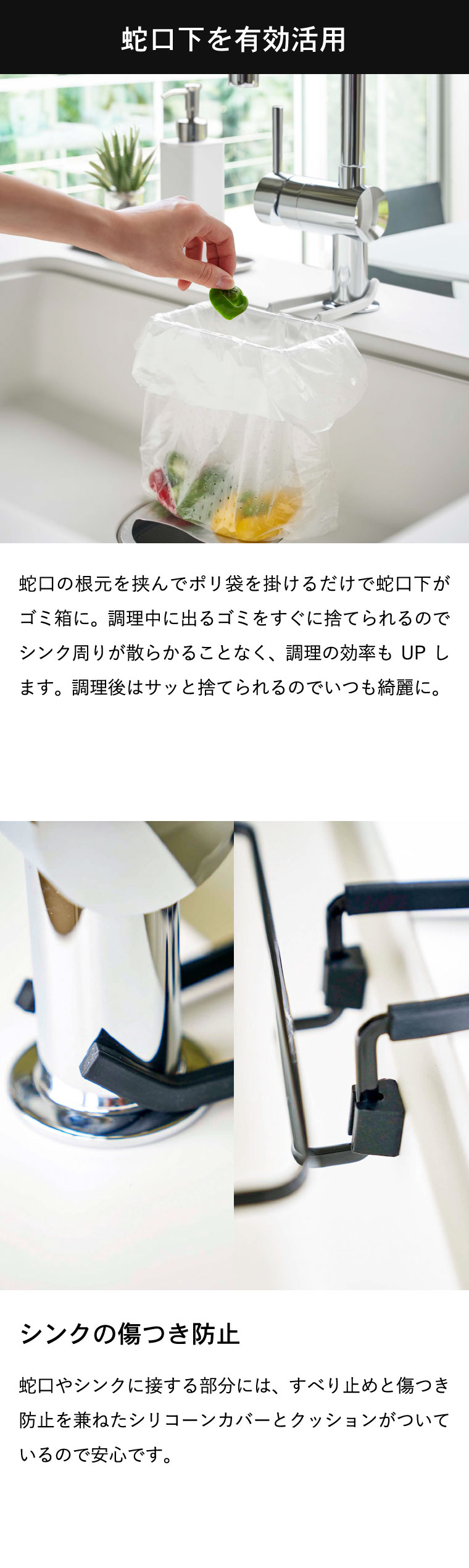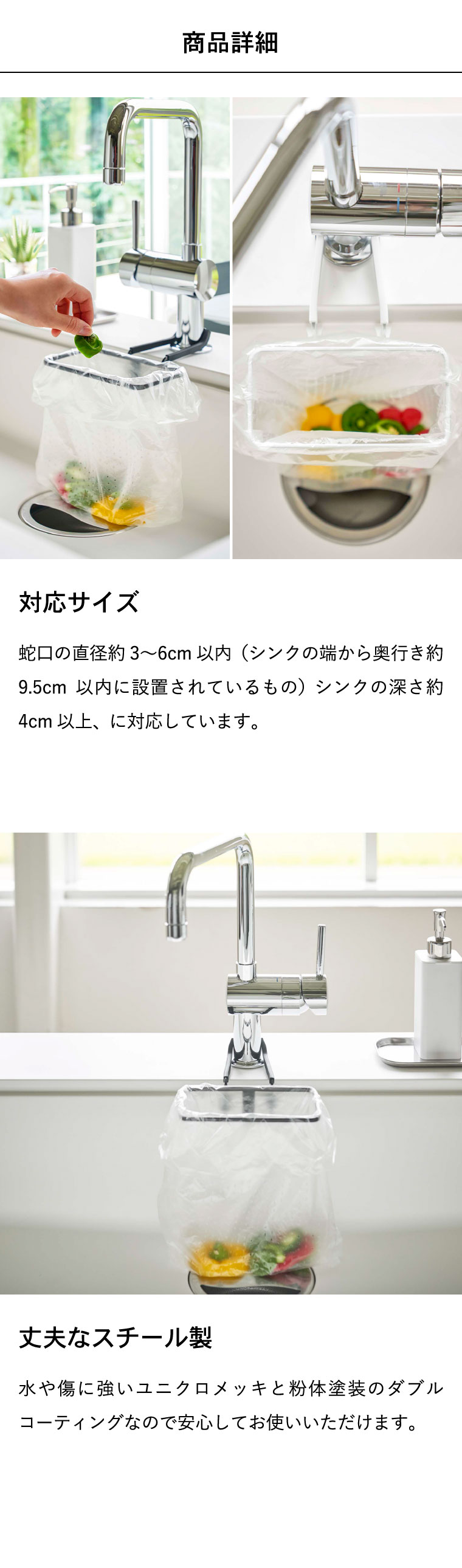 ●対応サイズ:蛇口:直径約3~6cm以内、シンクの端から奥行約9.5cm以内に設置されているもの シンク:深さ約4cm以上 ポリ袋:約W25cm以上のもの(周囲約50cm)