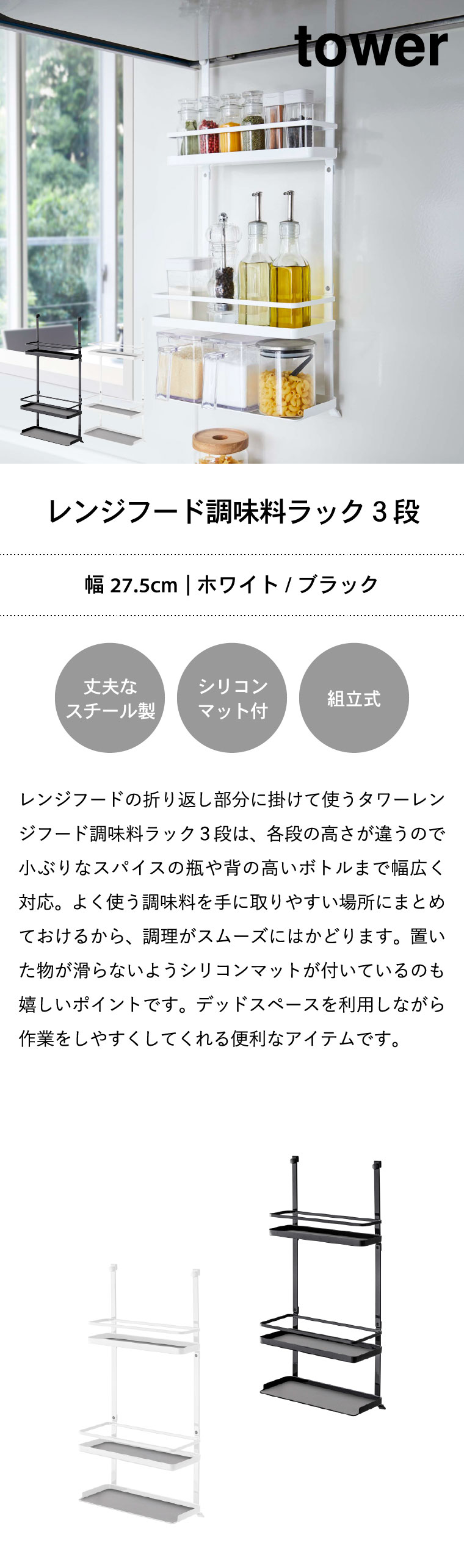 レンジフード調味料ラック 3段 タワー 山崎実業 tower 調味料 ラック ホワイト/ブラック 4836 4837 タワーシリーズ
