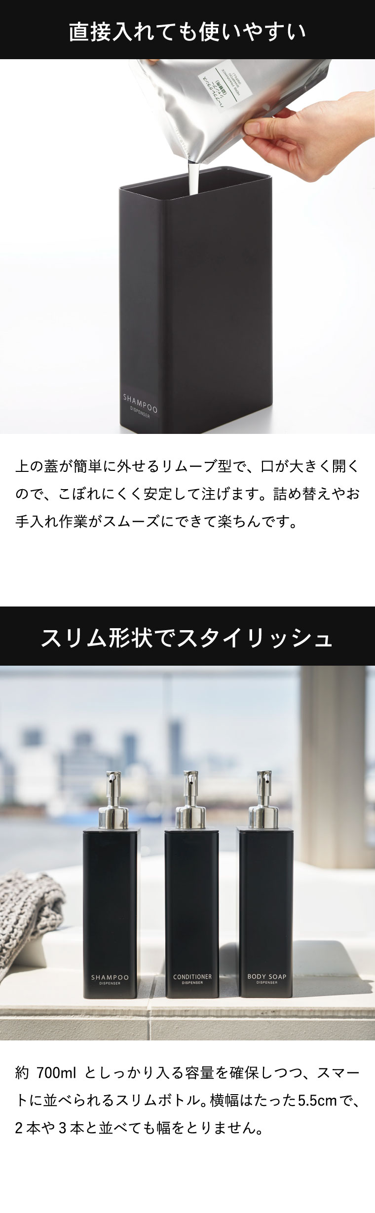 ツーウェイディスペンサー スクエア スリム 3個セット タワー 山崎実業 tower (シャンプー・コンディショナー・ボディソープ)ホワイト/ブラック タワーシリーズ