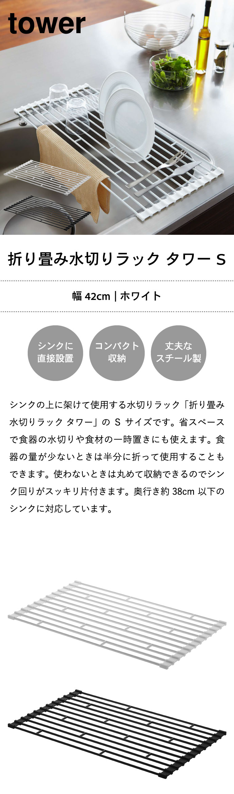 折り畳み水切りラック タワー 山崎実業 tower 折りたたみ水切りラックS ホワイト/ブラック 7837 7838 タワーシリーズ