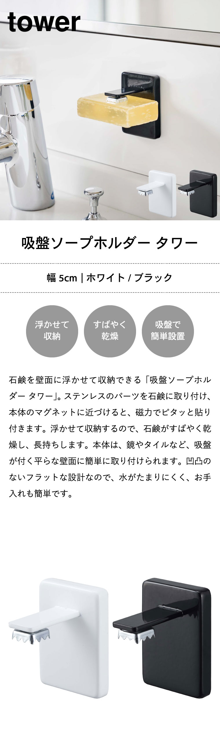 吸盤ソープホルダー タワー 山崎実業 tower 石鹸ホルダー ホワイト/ブラック 4871 4872 タワーシリーズ