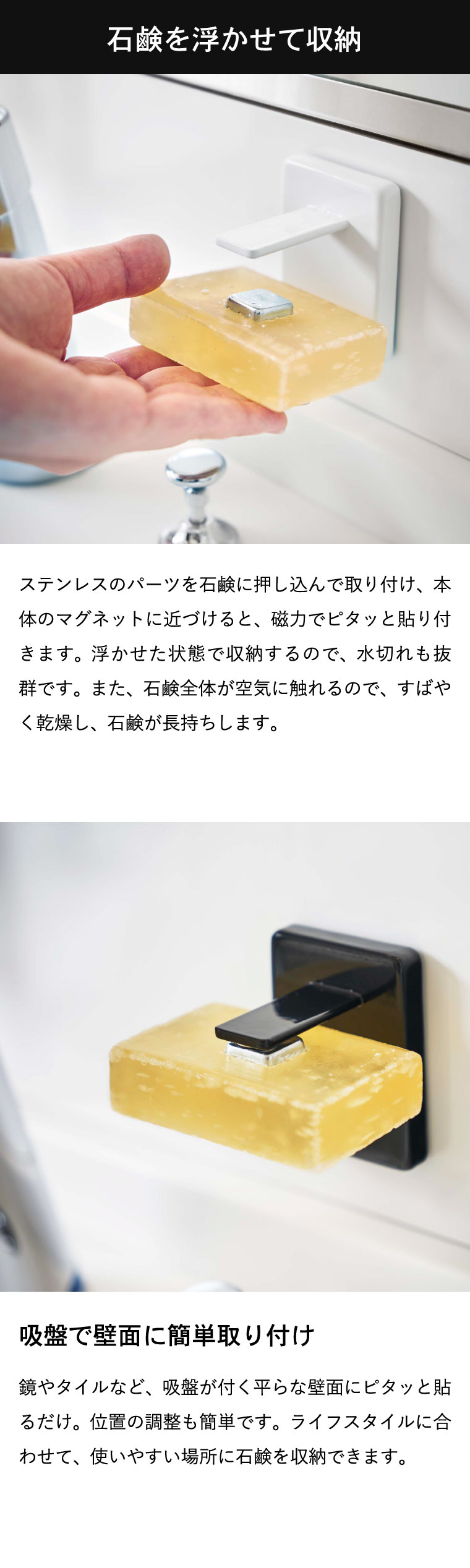 ●素材・材質:本体:スチール(ユニクロメッキ+粉体塗装) マグネット 滑り止め:シリコーン 石鹸ホルダー:ステンレス