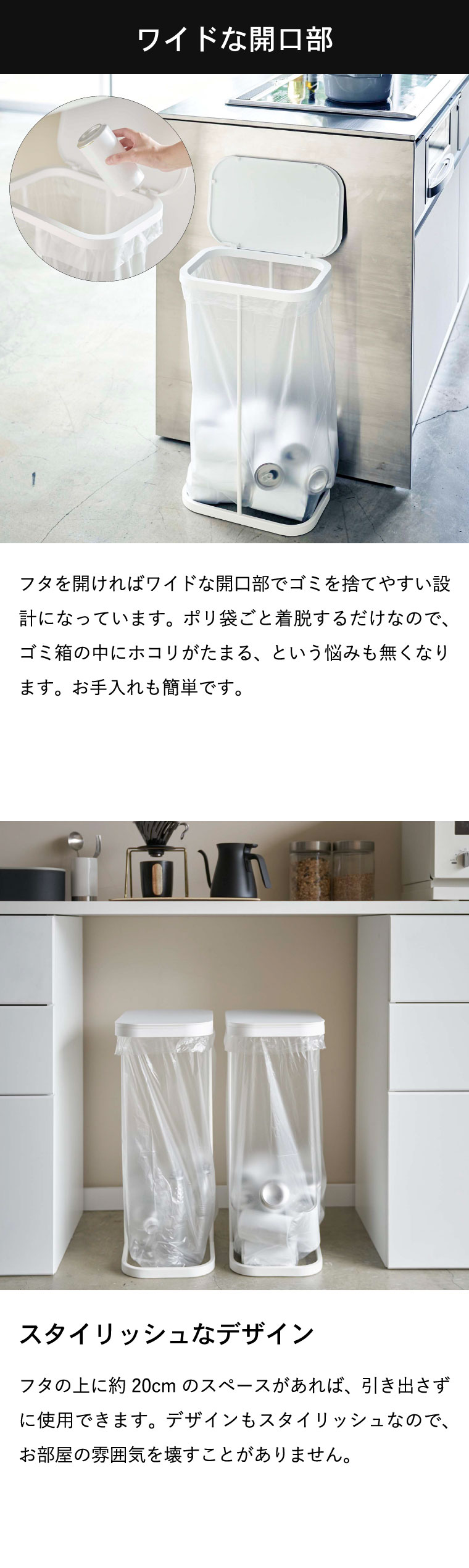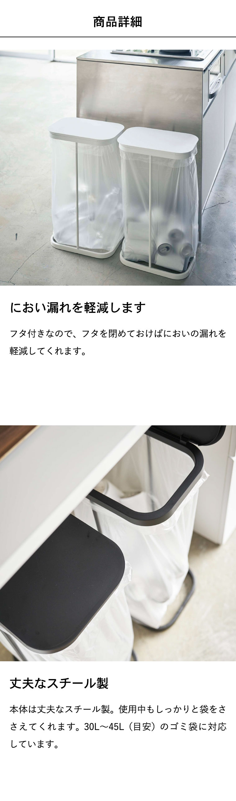 ●対応サイズ:■適応サイズ 30L~45L用ポリ袋(目安) ■蓋開口部 約W19×D29cm ■蓋開口時最大高さ約77cm