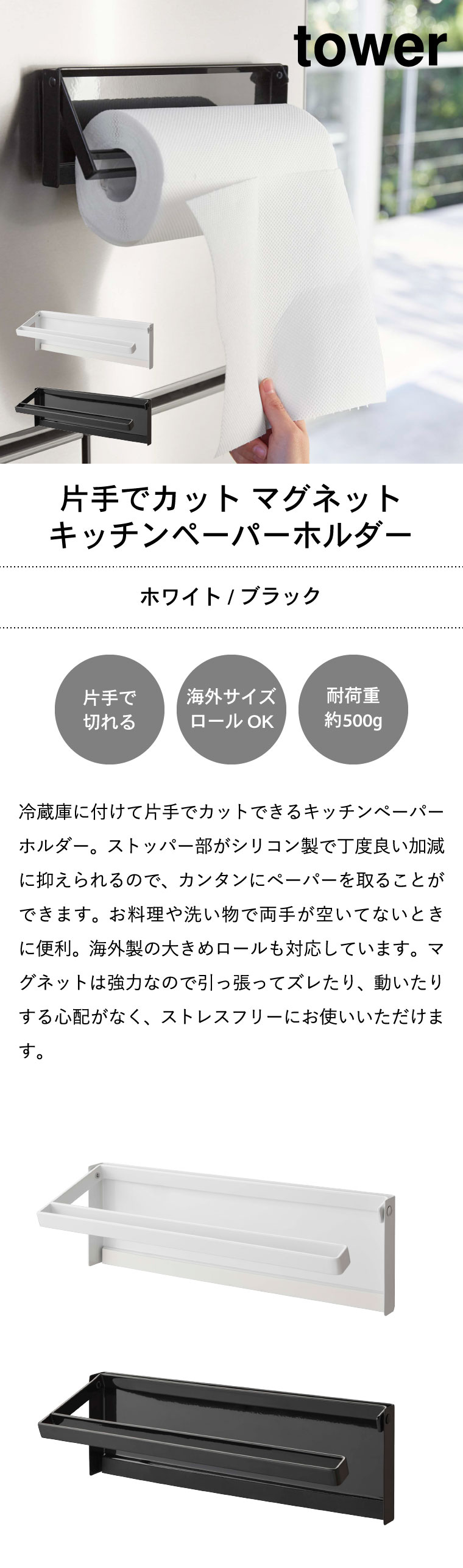 片手でカットマグネットキッチンペーパーホルダー タワー