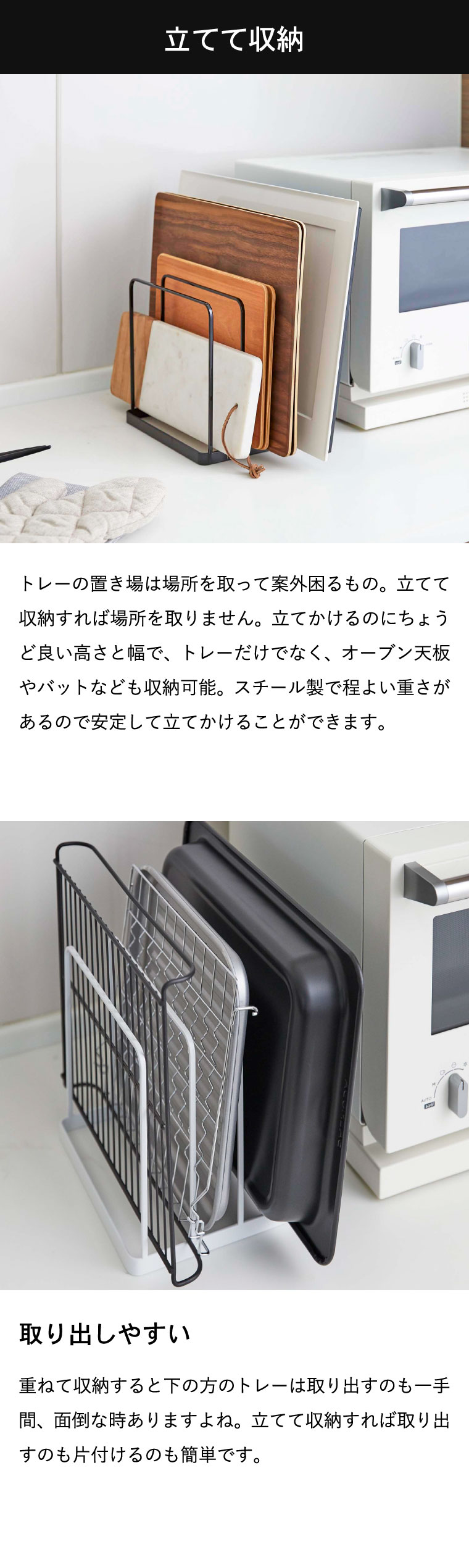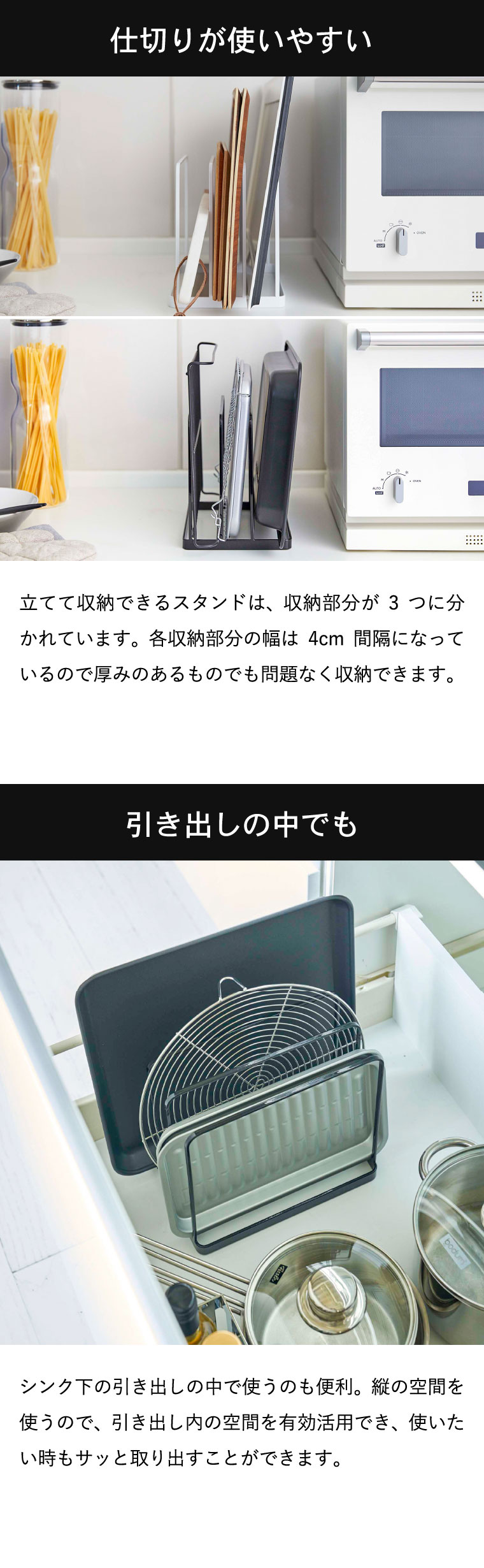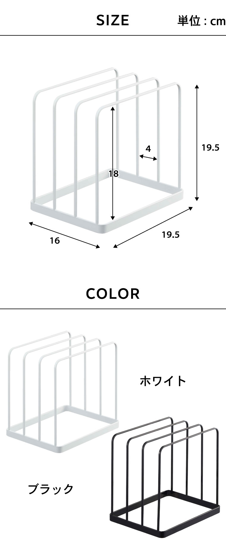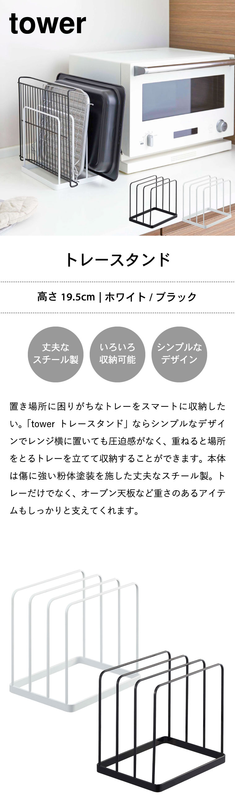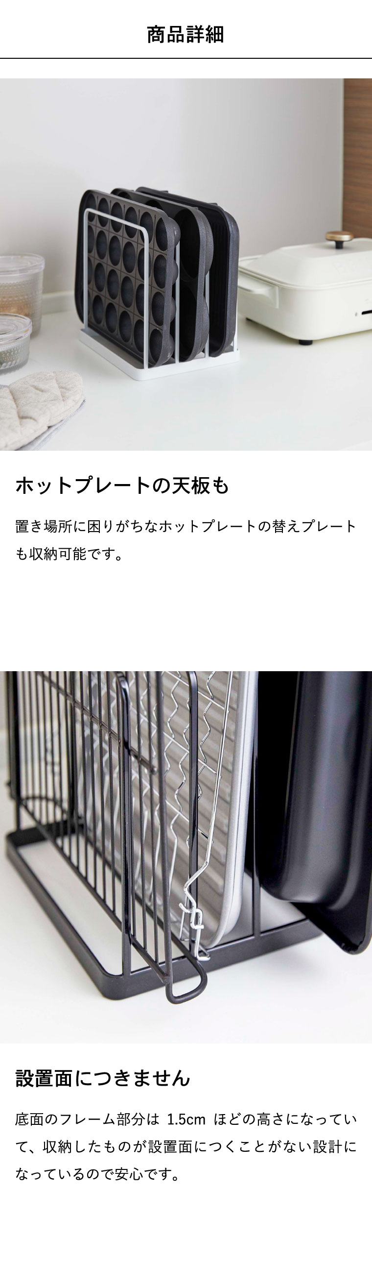 ●商品サイズ:約19.5X16X19.5cm ●商品重量:約530g ●内寸サイズ:各収納部:約W19.5×D4×H18cm ●素材・材質: 本体:スチール(粉体塗装) ●付属品:クッション×4 ●対応サイズ:約幅19.5cm以上 厚み4cmまでのキッチントレー・オーブン天板など ●JANコード:4903208050524 4903208050531