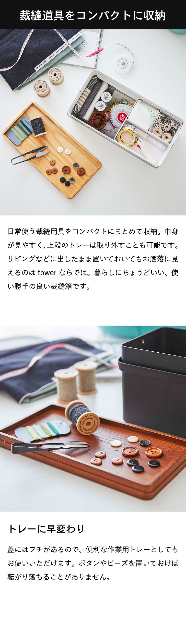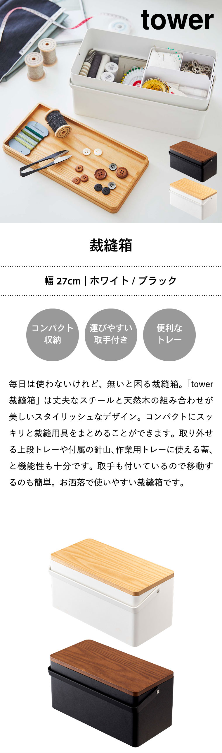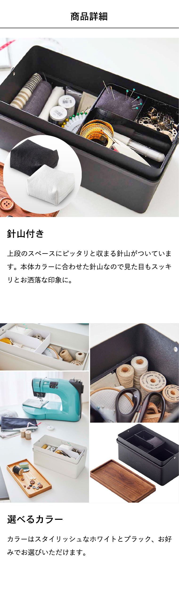 ●素材・材質:容器:スチール(粉体塗装) 蓋:天然木(ラッカー塗装) トレー:ABS樹脂 針山:綿100% クッション材:ポリエステル