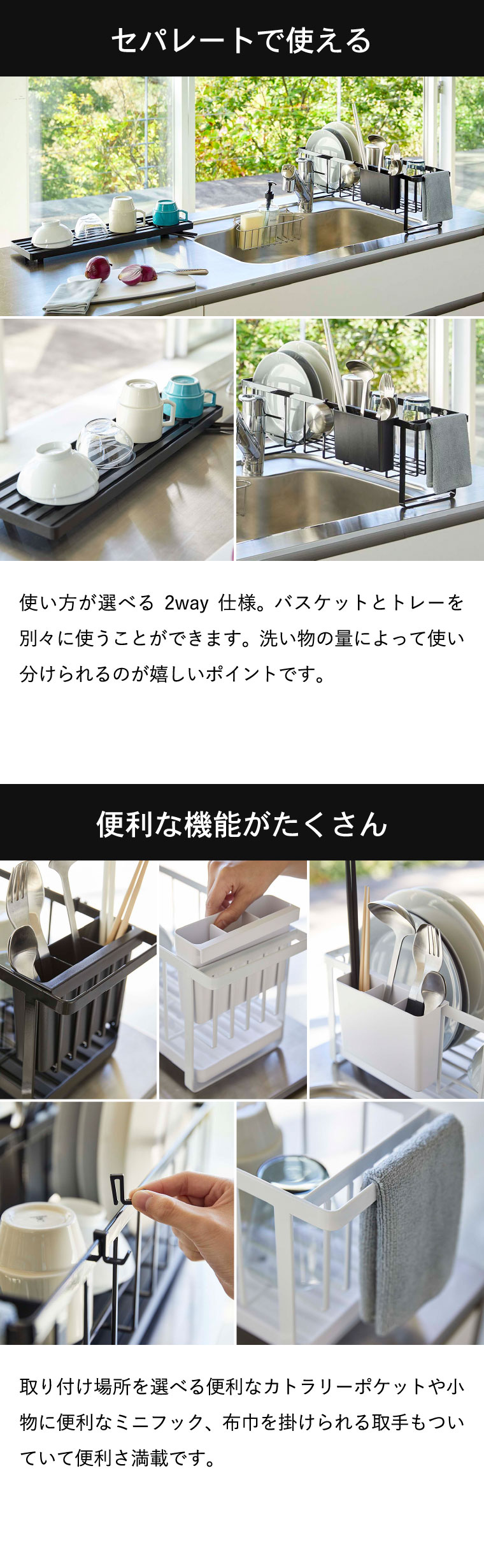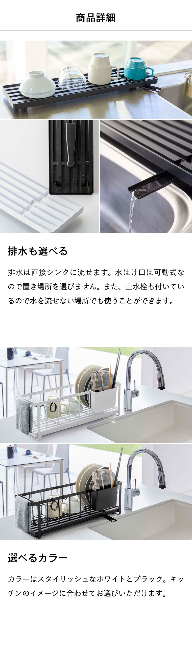 ●素材・材質:ワイヤーバスケット:スチール(ユニクロメッキ+粉体塗装) 水切りトレー・カトラリーポケット・フック:ABS樹脂 水はけ:ポリプロピレン 水止栓:シリコーン