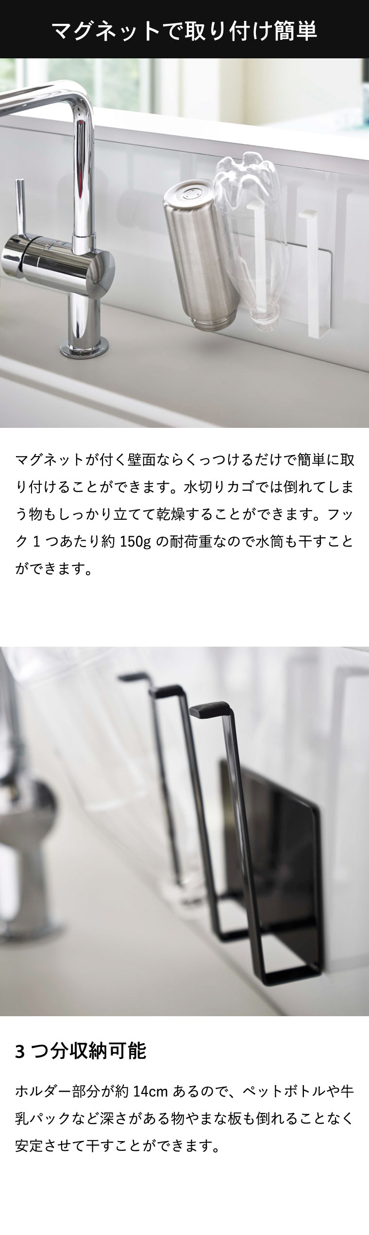 ●商品サイズ:約13.5X6.5X14cm ●商品重量:約300g ●素材・材質:本体:スチール(ユニクロメッキ+粉体塗装)マグネット 滑り止め・キャップ:シリコーン ●耐荷重:約1.5kg(ホルダー1つあたり:約500g) ●JANコード:4903208051361 4903208051378