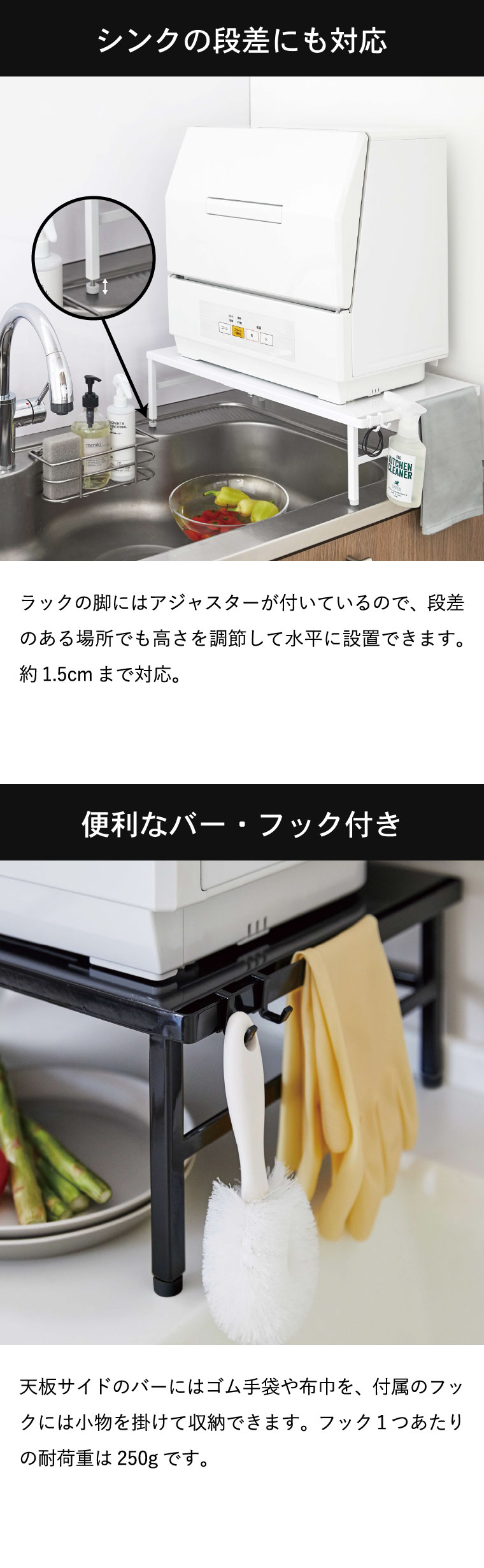 ●耐荷重:棚:約60kg フック1つあたり:約250g